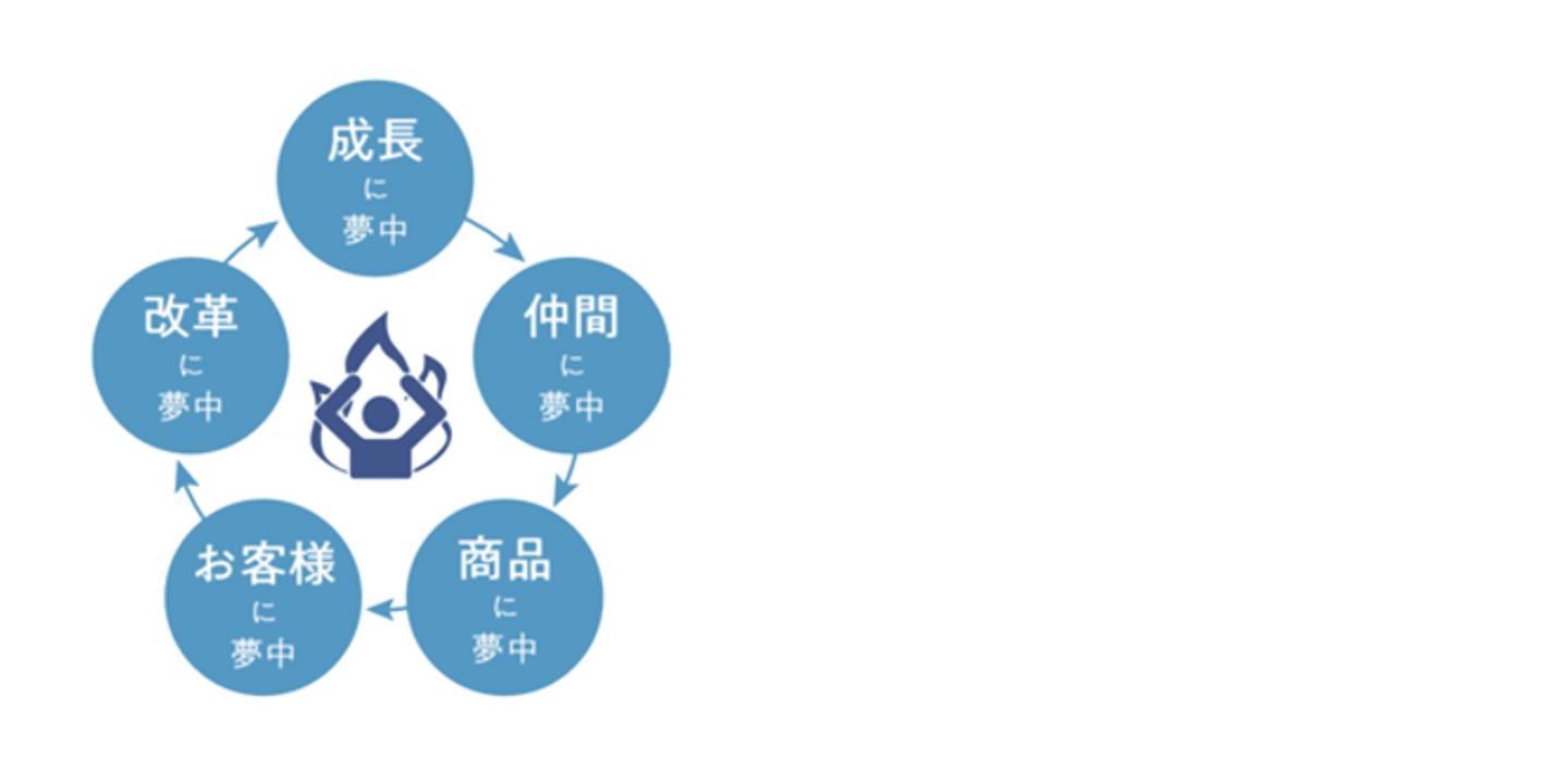 成長に夢中、仲間に夢中、商品に夢中、お客様に夢中、改革に夢中