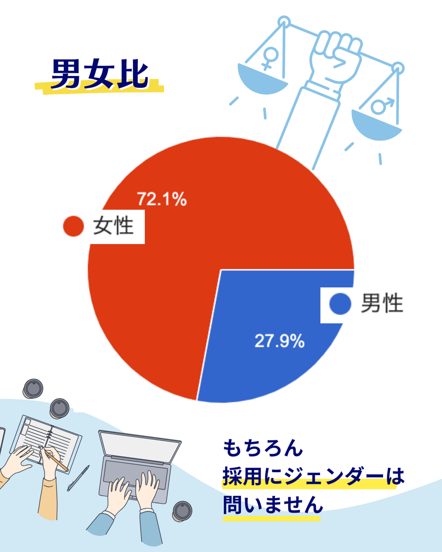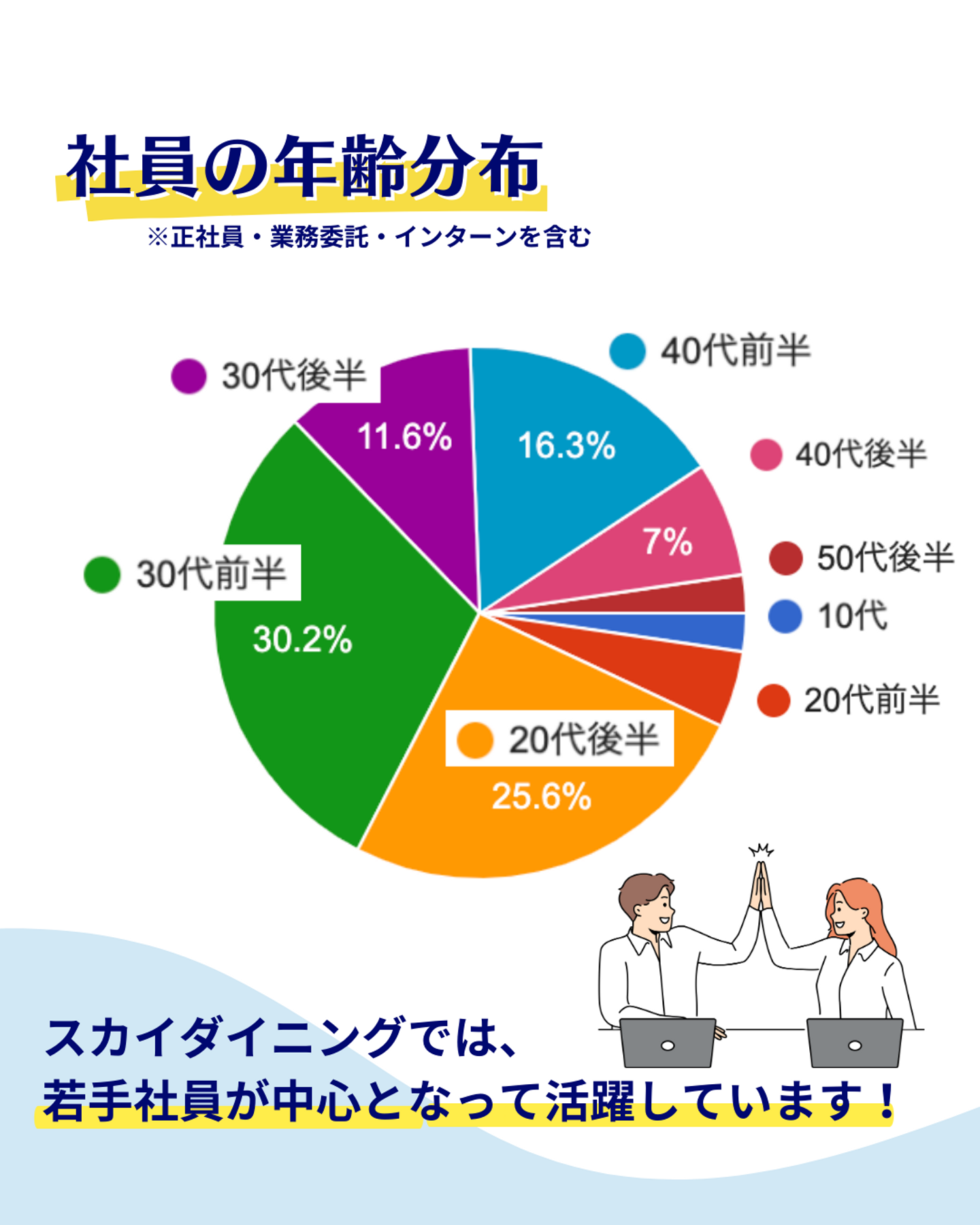 スカイダイニングでは、20代後半〜30代前半の社員が全体の半数を占めており、若手が中心となって活躍している企業です。男女比で言うと、業務委託スタッフを合わせると約7割が女性となっています。