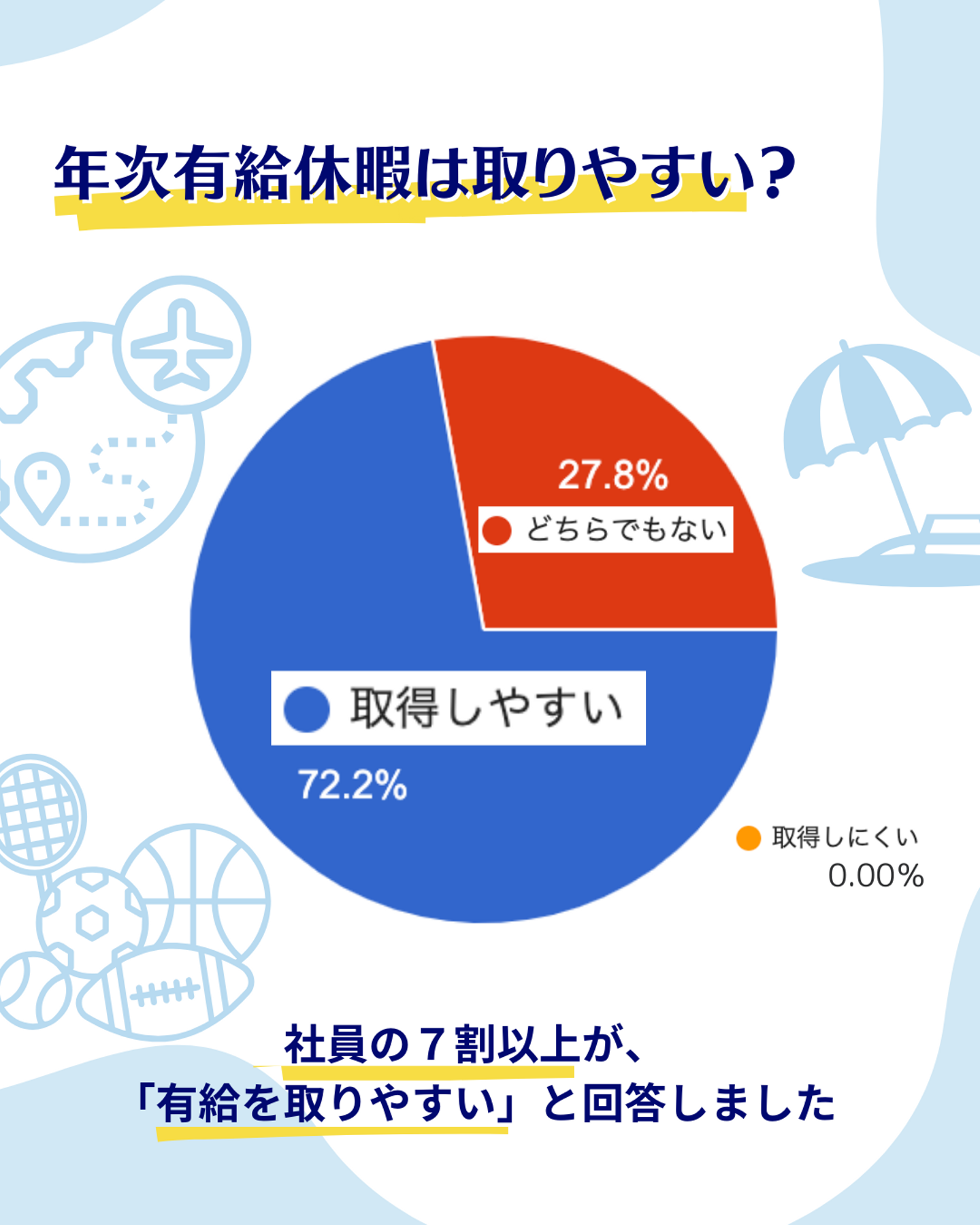 これは、実際に社員からのヒアリングデータが一番説得力があるのではないでしょうか。社内アンケート調査の結果では、約7割が「有給を取りやすい」と解答しました。