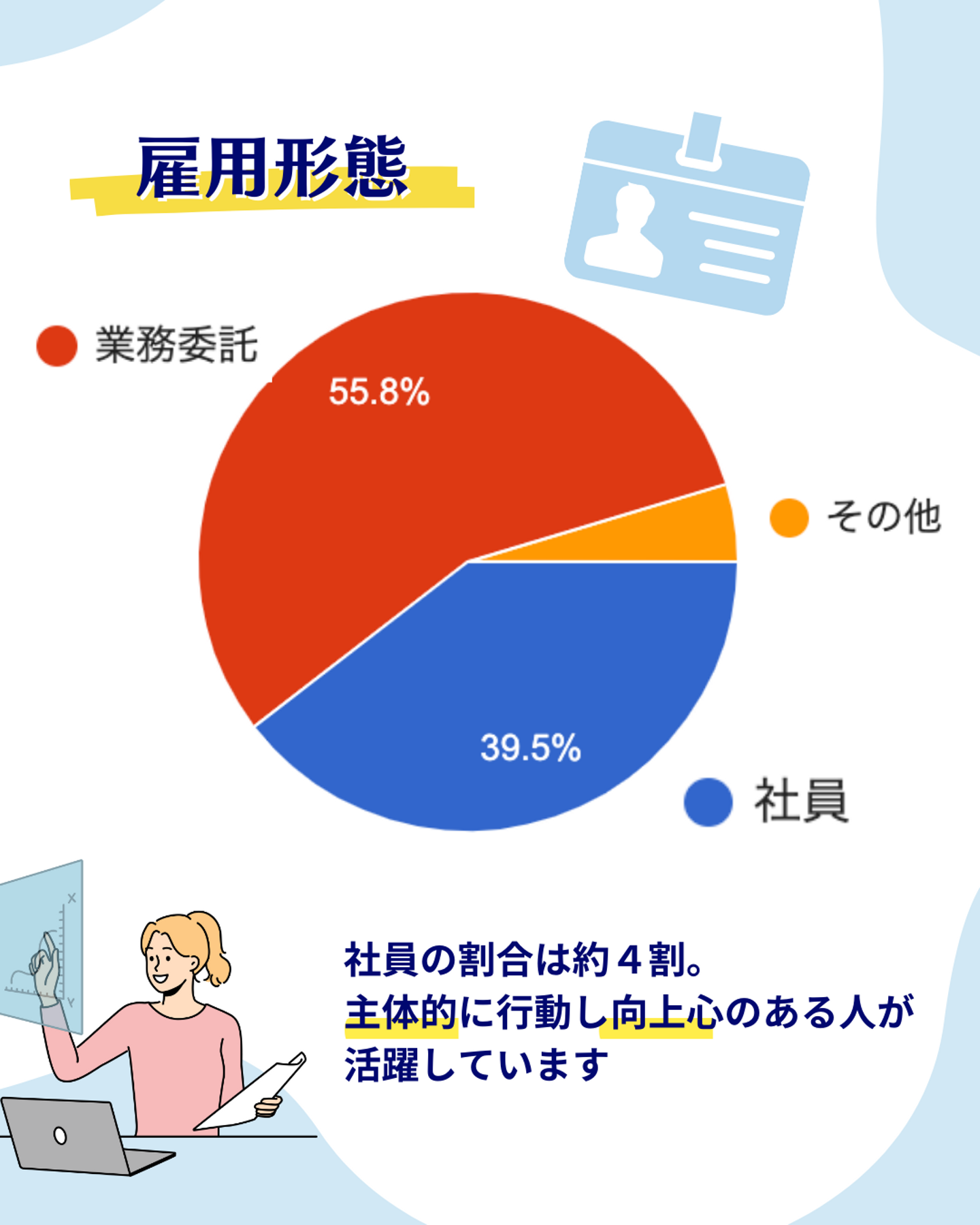 雇用形態で見てみると、社員が全体の約4割。多くの業務委託スタッフとともに働いています。