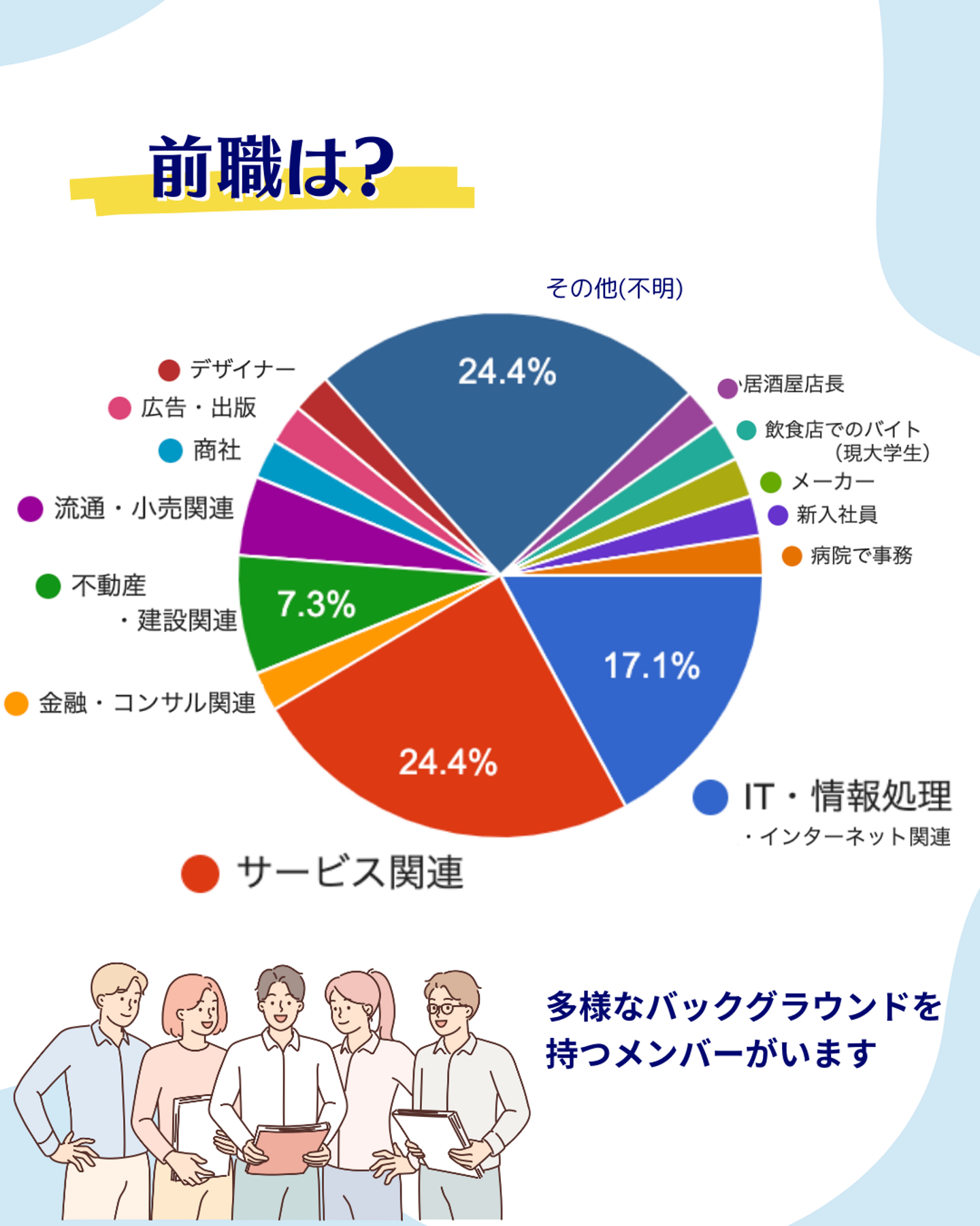 スカイダイニングの社員の前職は様々です。IT業界やサービス業出身者が約4割を占めますが、他には、多種多様なバックグラウンドを持つメンバーが集まっているからこそ、多角的な視点を持ってアイデアを形にしています。