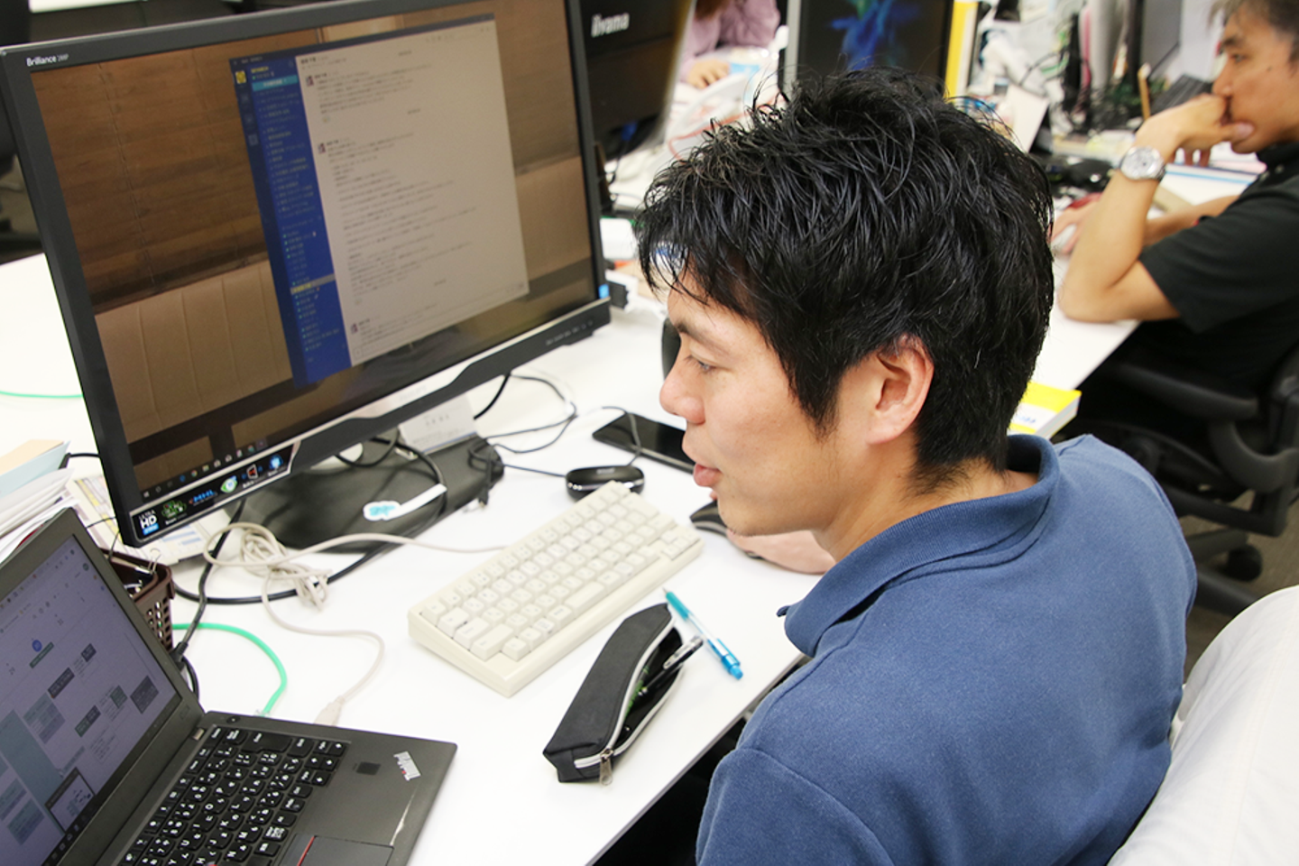 営業本部付のエンジニア、プリセールスの分野を担当しています。プリセールスは、営業とお客様の商談の場に同行し、技術的な問いに対して回答したり、営業が掴みきれない部分を技術の目線でヒアリングし、お客様がやってほしいことの根本を見つけ出すことで、提案の精度を上げる役割を担います。また、できないことをリクエストされたら、曖昧に濁さずハッキリとできないと伝えつつ、別の方法やアイデアを投じることもあります。