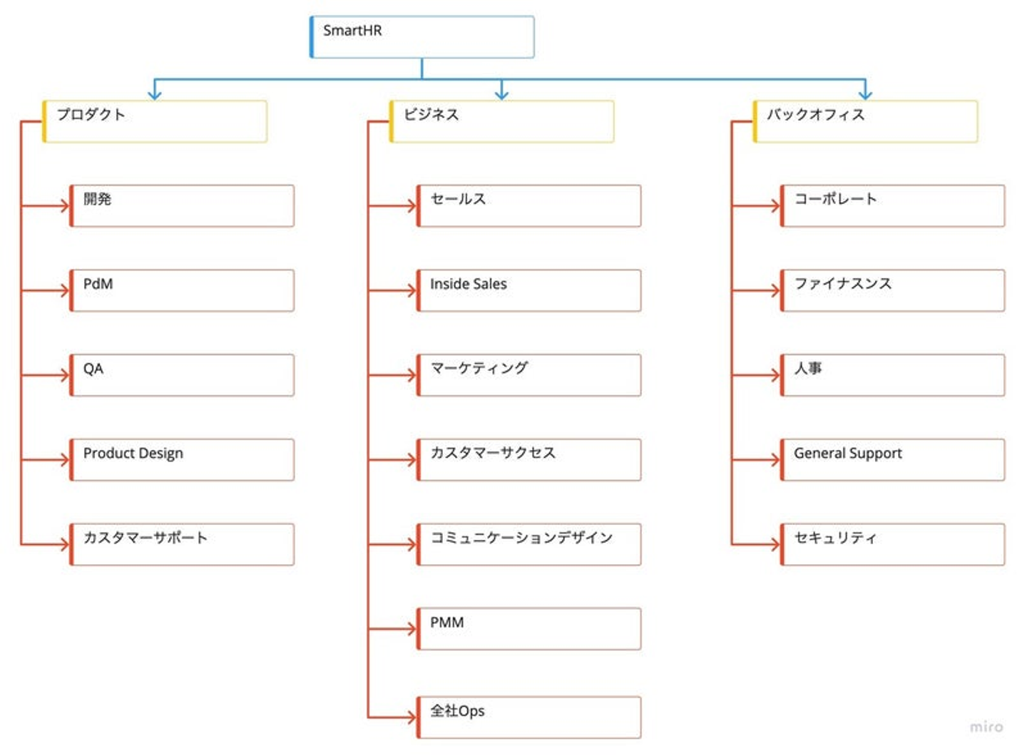 SmartHRの組織は、ざっくりプロダクト・ビジネス・バックオフィスの3セクションにわかれています。