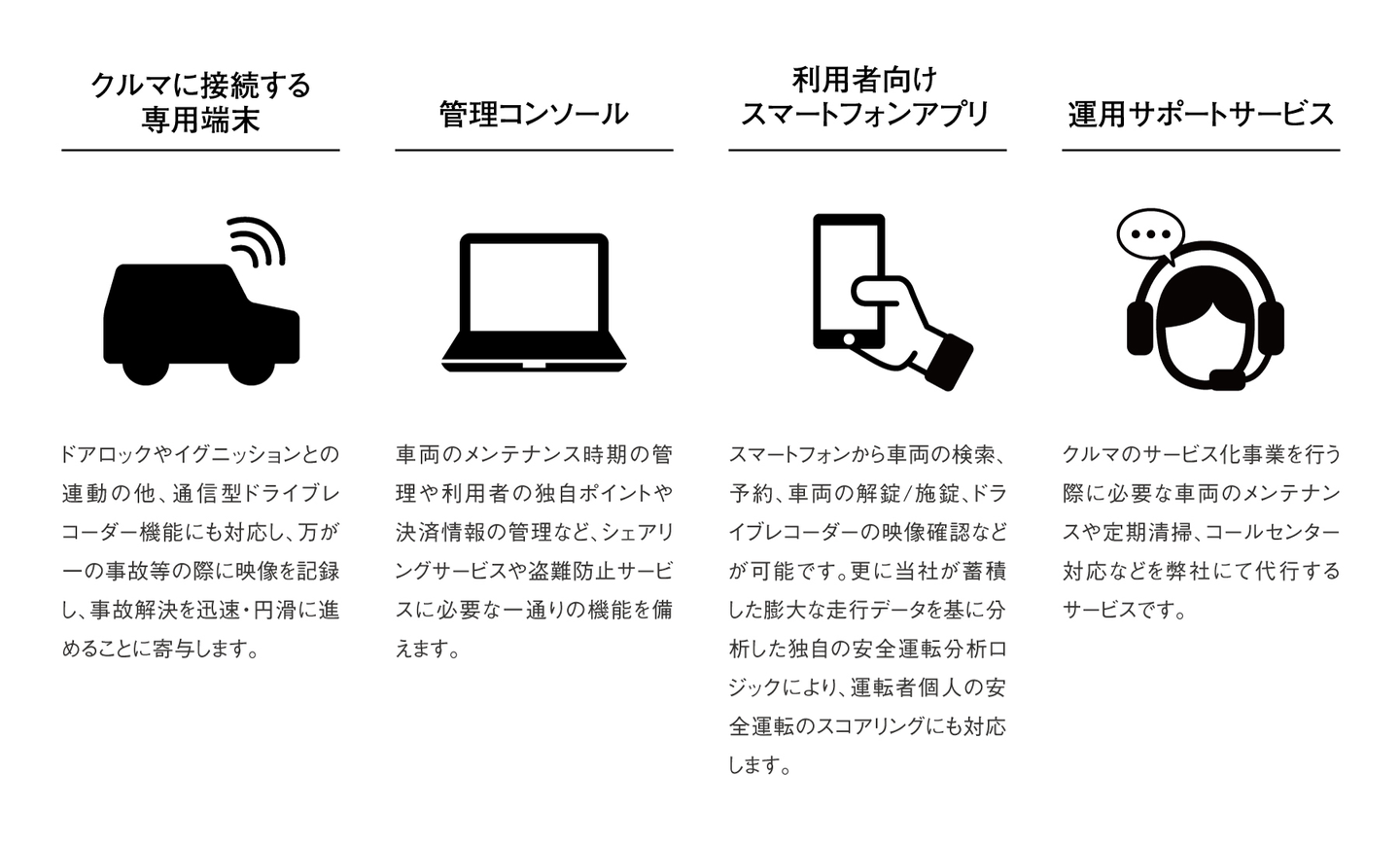 クルマに接続する専用端末、 クラウド上の管理コンソール、 利用者向けスマートフォンアプリ、 運用サポートサービスで構成されます。