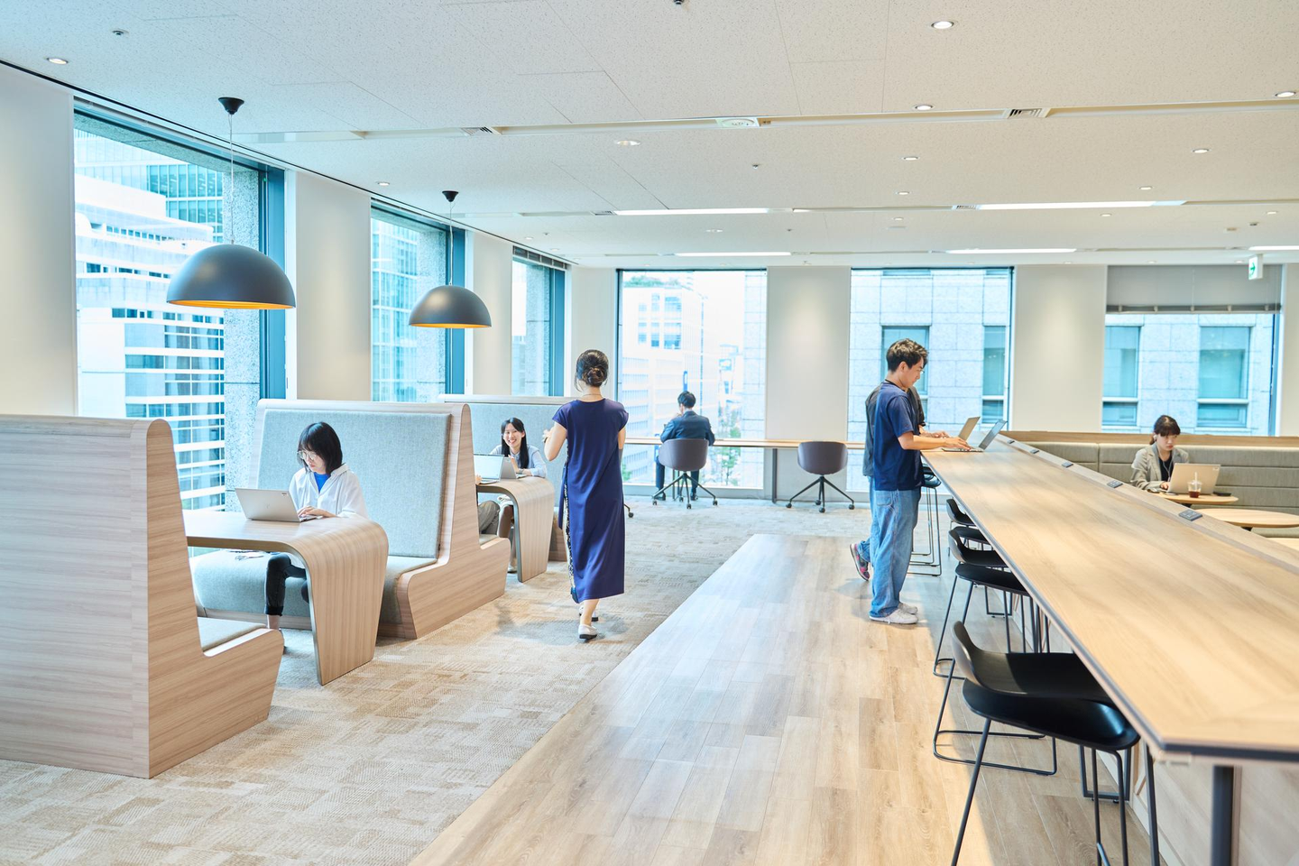 数年前に淀屋橋に新しくオフィスを移転し、執務室の固定席とオープンスペースでのフリーデスクを使い分けながら働いています。テレワーク制度や時差出勤の活用なども広がりました。
