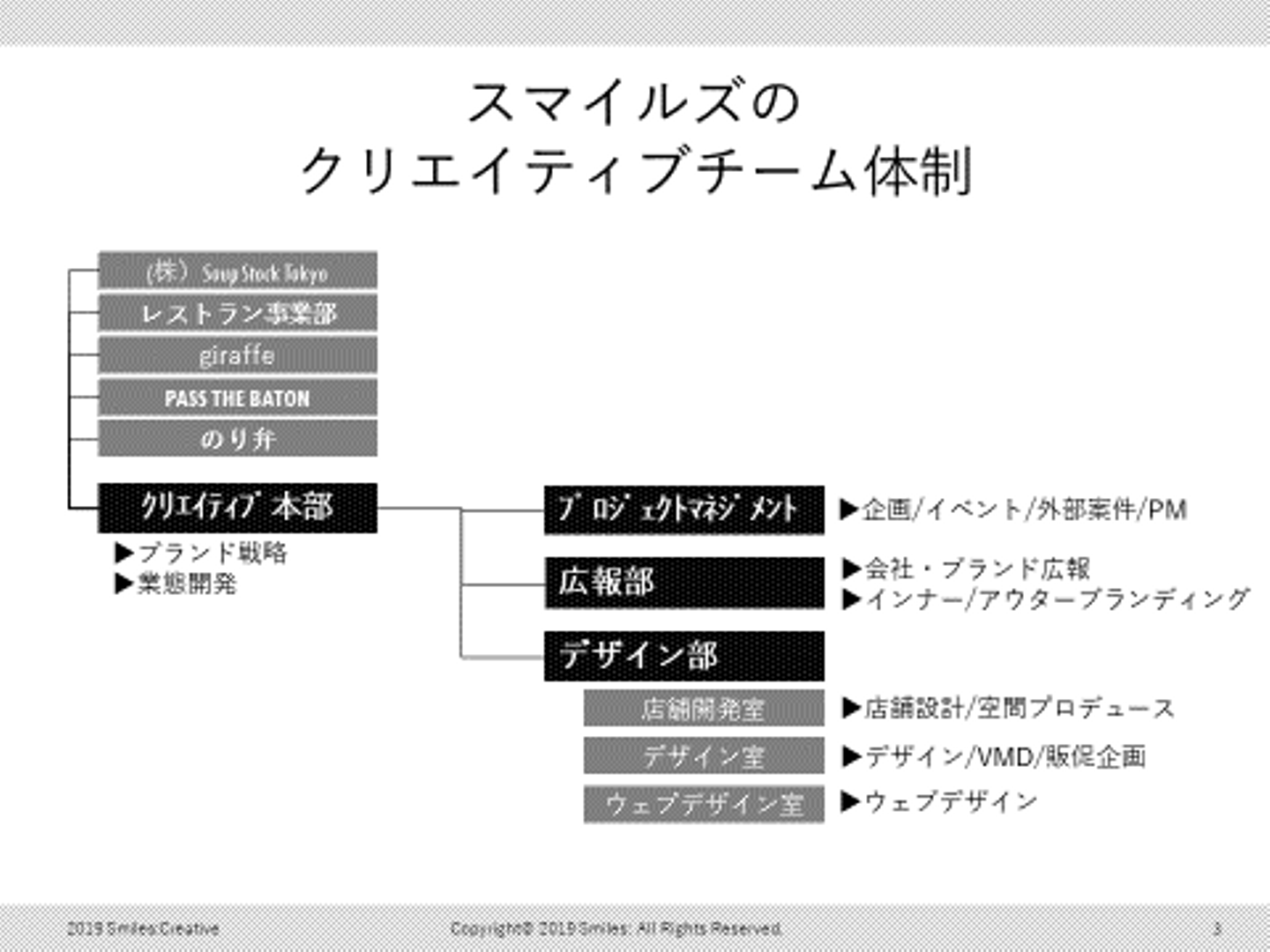 中神:スマイルズの「広報部」は、「クリエイティブ本部」の組織の中にあるというのもユニークなところ。私が思うに、とにかくこのチームには様々な分野の「プロ」が揃っているんですね。吉本が言ってくれた『個性』にも似てる。ブランディングから販促まで幅広くプロジェクトの進行管理や旗振りをする“プロジェクトマネージャー”、店舗設計から空間プロデュースまで「場」のことならすべて任せられる “店舗開発室” 、グラフィックデザインやアートディレクションなら“デザイン室”、ウェブデザインは“ウェブデザイン室”……みんなで一つのお店をつくることができるチームです。「クリエイティブ本部」にはもちろんのこと、他の事業部にもたくさんの頼れる「プロ」がいるんです。「一流の人々と一緒に、一流のモノを作ることができる」という点で、私はとっても楽しいのですが、一方で、入ったばかりの頃はそれが不安だったのも事実。