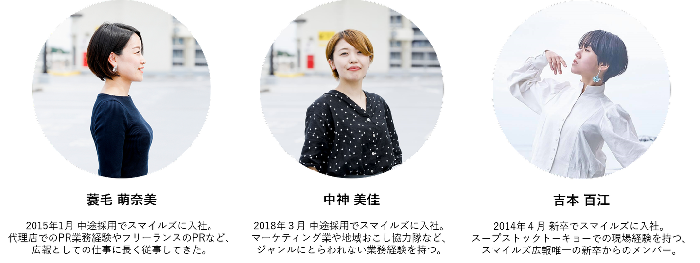中神:私はこれまで、マーケティングの仕事を続けてきたり、地方を盛り上げようとする活動「地域おこし協力隊」に参加したりと、ここにいる蓑毛や吉本とはちょっと違った経歴を持っています。「広報」のメンバーとして働くのはスマイルズが最初でした。