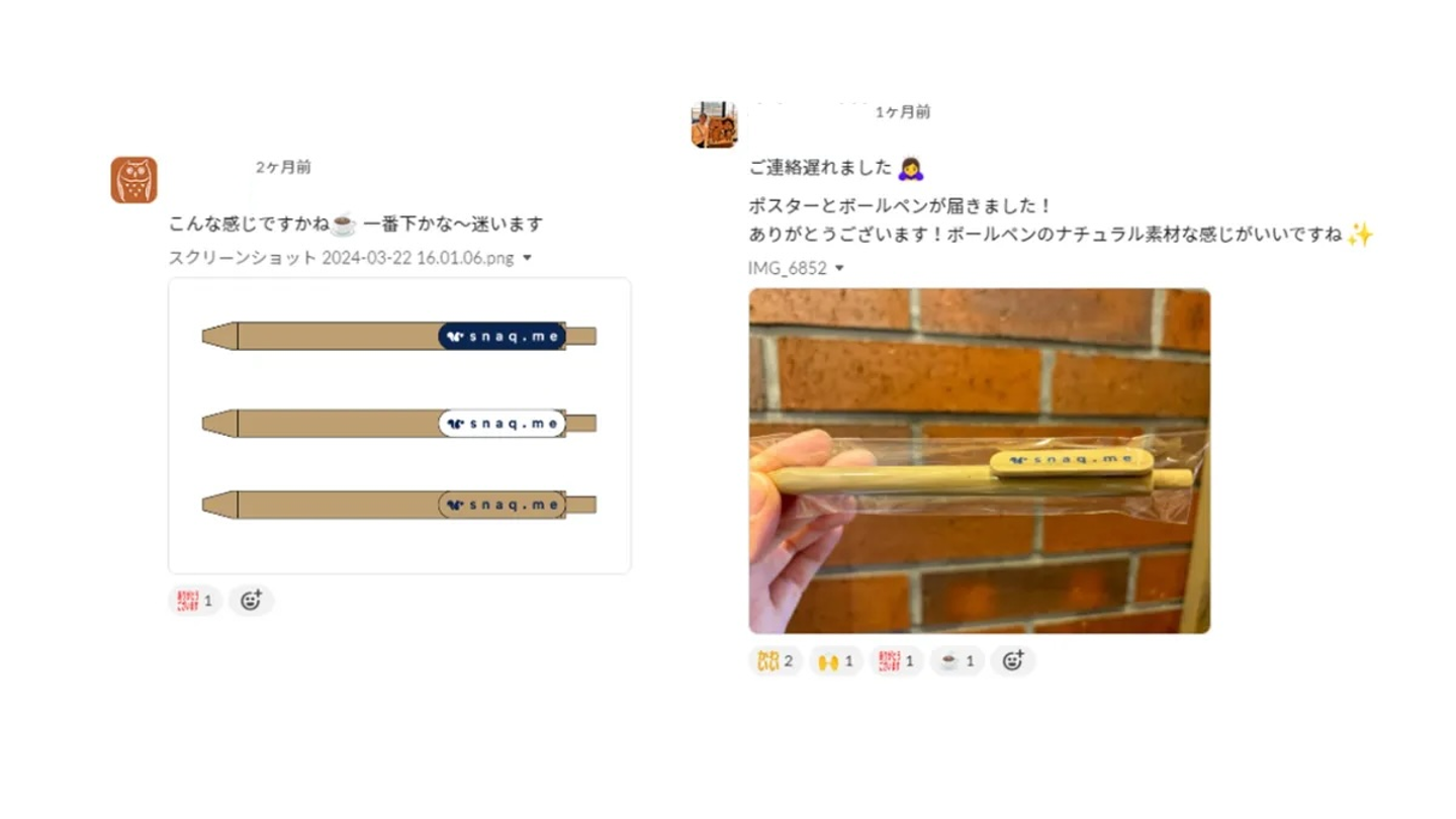 ▼デザイン考案時のデザイナーと、納品されたボールペンを清澄白河店店長が受け取ったときの様子。業務連絡に留まらず、ちょっと嬉しくなる「かわいい」「☕」などのスタンプが行きかういつもの光景です。