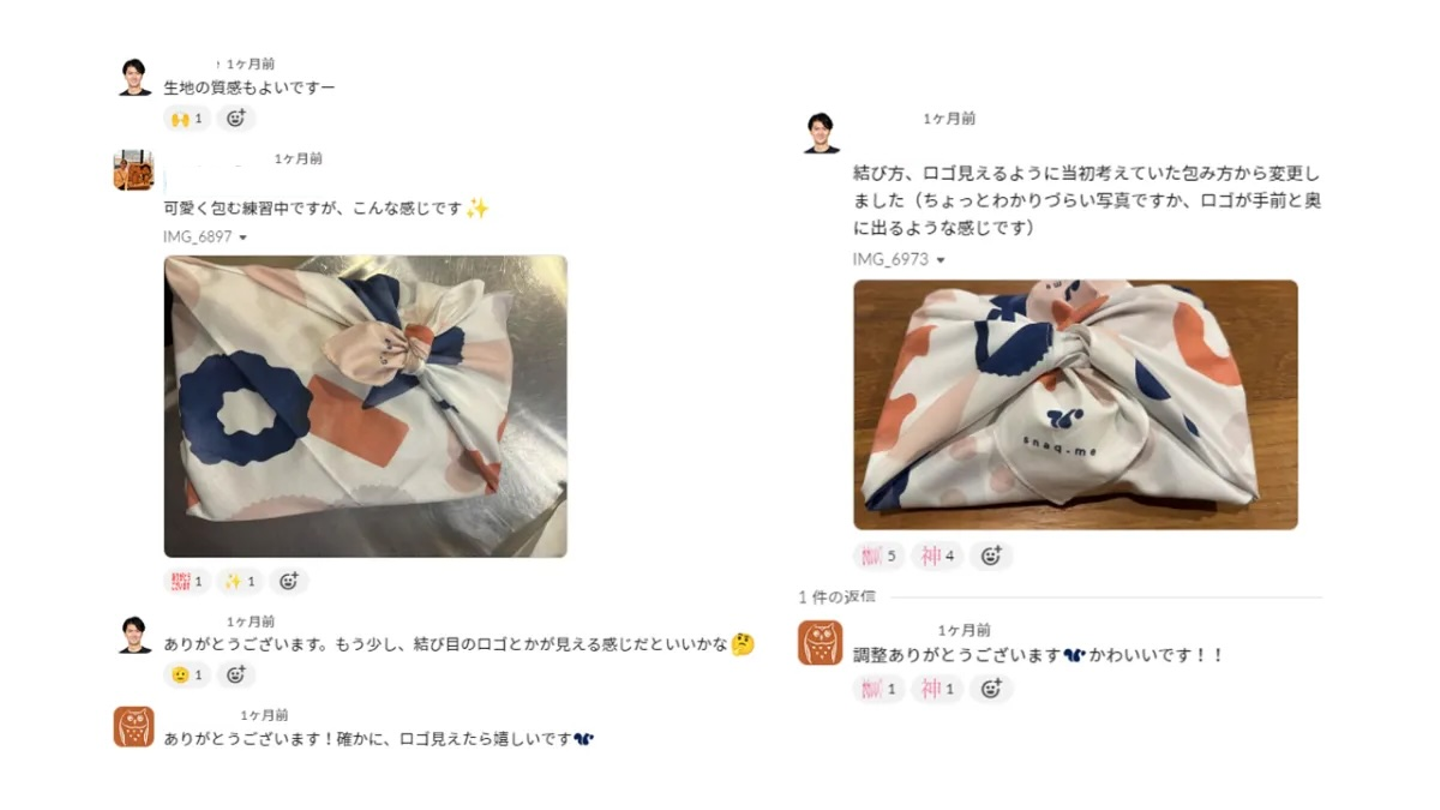 ▼オフライン事業チーフ・清澄白河店店長・デザイナーが、納品されたバンダナの包み方について相談している様子。クリエイティブチームなどの内勤スタッフが勤めるオフィスは水天宮前にあるので、清澄白河の店舗とは少し離れていますが、slackを活用していつも気軽にコミュニケーションをとっています。