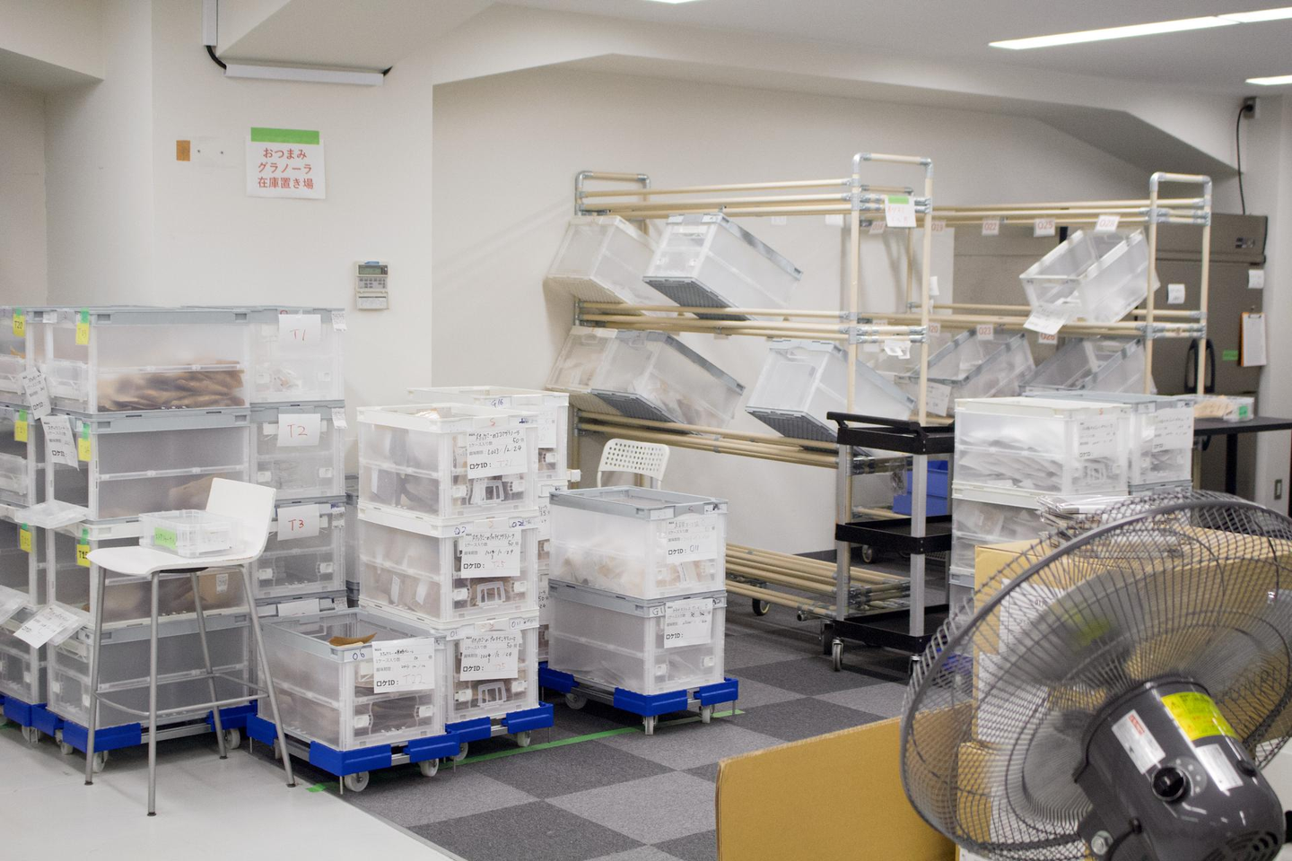 商品チャネル、商品ごとにパッケージングされたおやつたち。パッケージング後は、物流/出荷フロアに運ばれます。物流/出荷フロアでは、お客様ごとに注文された商品を箱詰めしています。