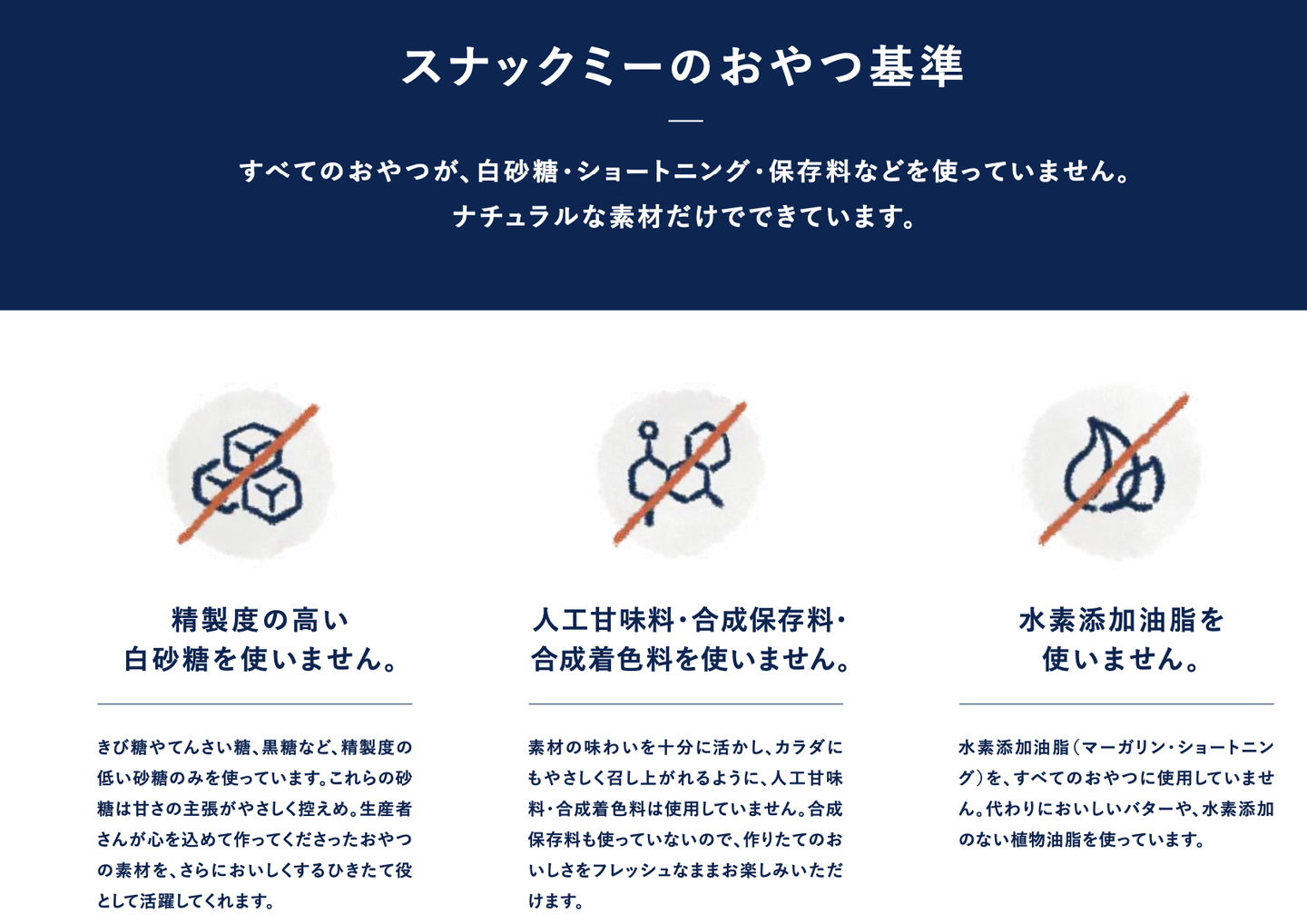 白砂糖を使わずきび糖・てんさい糖・黒糖などの茶色いお砂糖を使用し、人工甘味料・合成保存料・合成着色料を使わず、マーガリンやショートニングも使用していません。おやつで使わずに、美味しいものをお届けしたいというこだわりを持ってお届けしています。