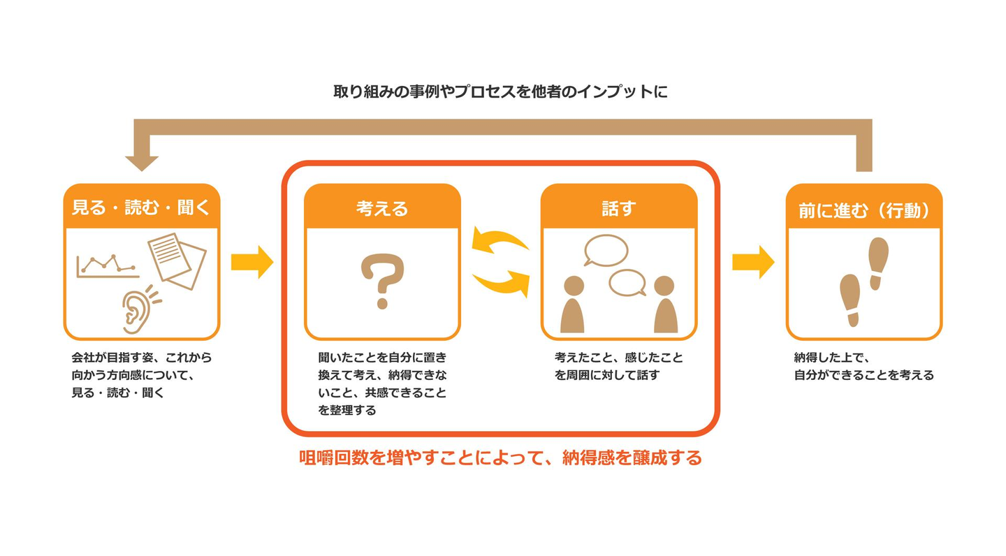 伝えたい情報を社員の目や耳に届くメディアを使って伝達するだけでなく、社員がそれについて考えたり話したりすることができる機会と時間を提供することが必要です。それによって、伝えた情報を一人ひとりの社員がしっかりと咀嚼できるようにし、もしビジョンに納得して自ら「行動したいと」思う人がいれば会社が背中を押す、というような流れに持って行くことが理想的なプロセスと言えるでしょう。