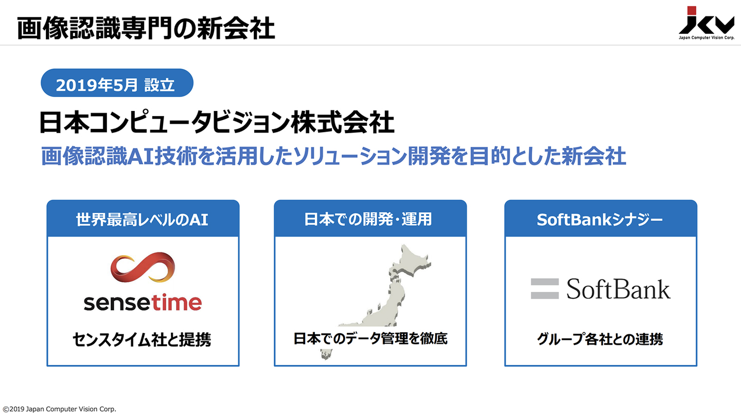 本島 日本コンピュータビジョンは、世界最高レベルのAI技術をもつ香港のセンスタイム社を技術パートナーに、2019年5月にソフトバンクの子会社として設立されました。”コンピュータビジョン(画像認識)”という要素技術を日本でさまざまな事業領域に適応し、展開し販売していくことを目的につくられた会社です。