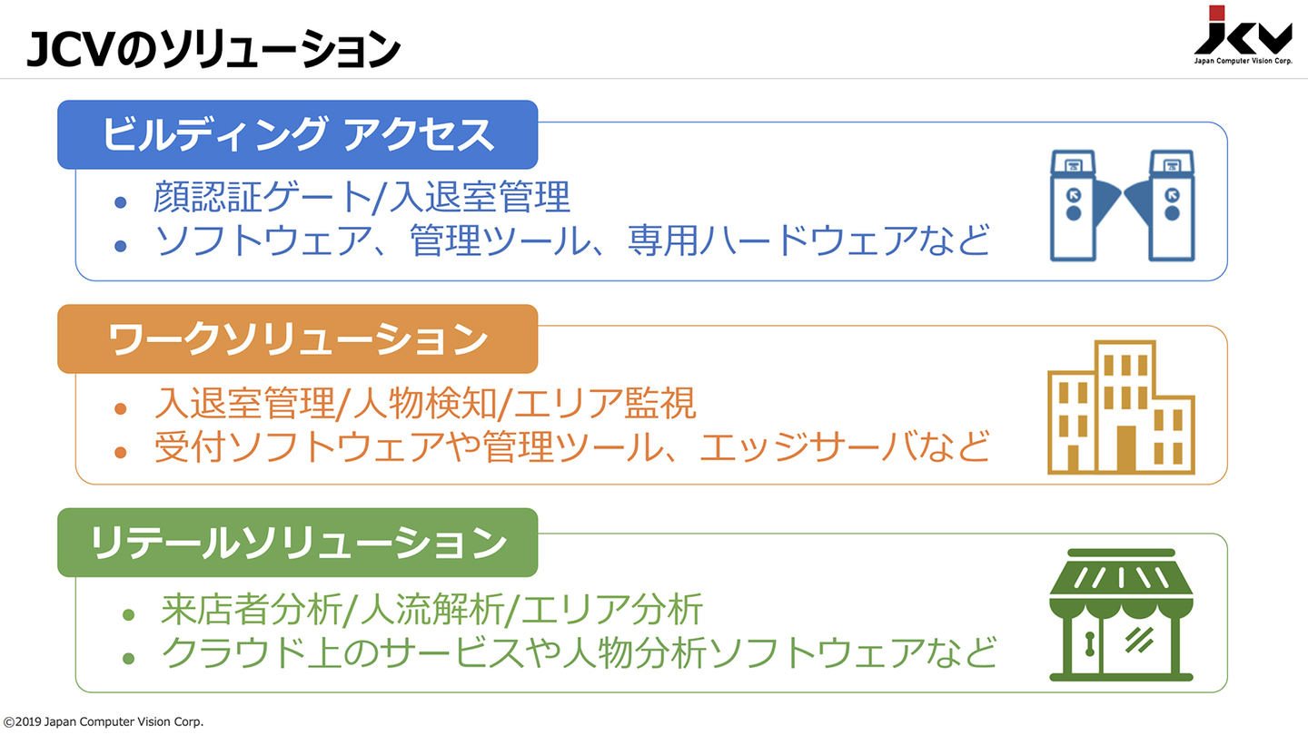 画像認識の領域は非常に広く、日本コンピュータビジョンとしては将来的には全部手掛けていきたい。まずは生体認証の利便性を理解をしていただきやすい領域から、順番に広げていく。まずは安心・安全の領域であるアクセスコントロール、ビルの入退館管理などから初めて、その後それに近いスマートオフィスの領域、そしておもてなしの領域である店舗や商業施設の空間デザインの最適化や、受付や案内の効率化、決済の利便性の向上、オフィス環境の向上などを実現していく考えです。