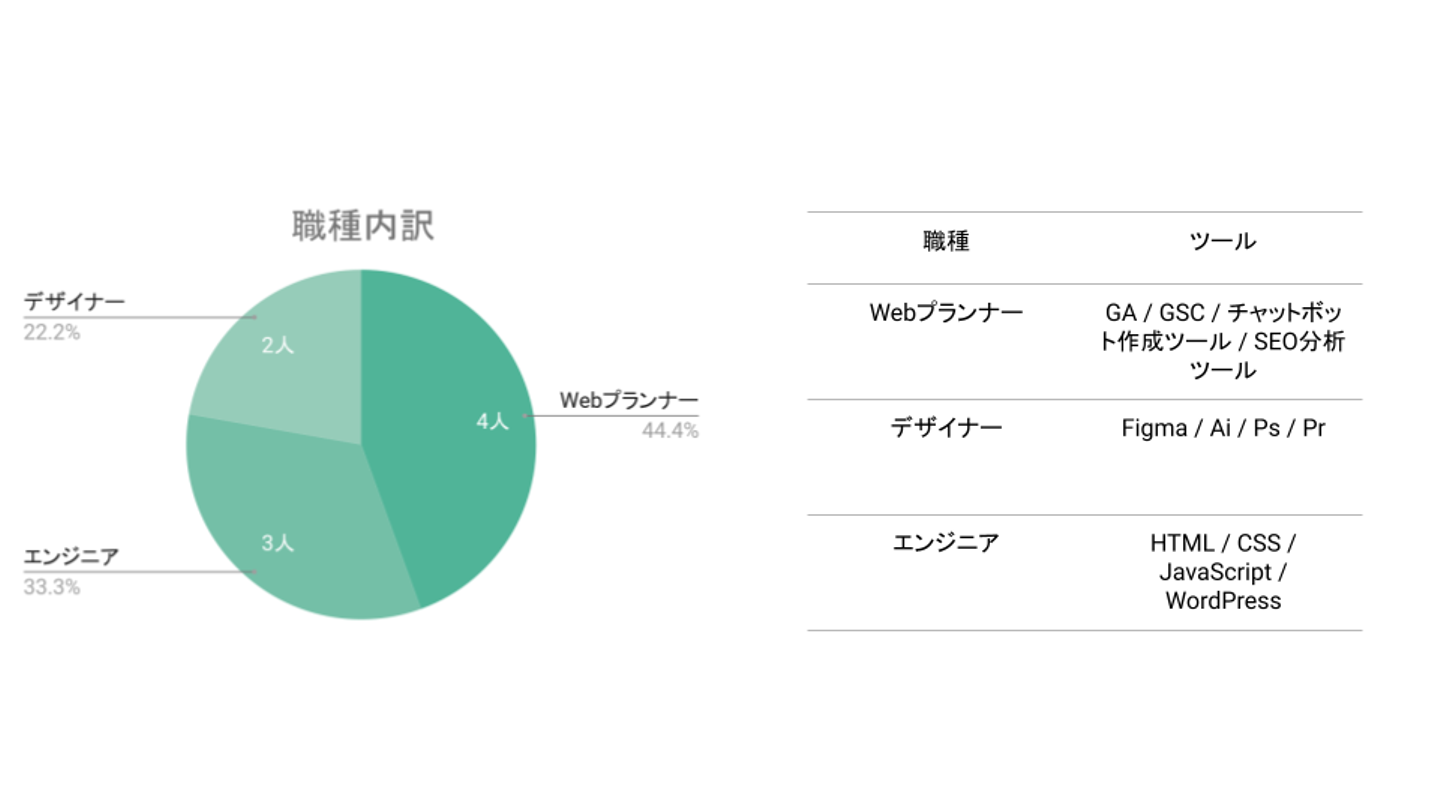 図の右側が職種ごとの普段使用するツールです。どの職種も様々なツールを使って業務に取り組みますが、完璧に使いこなせる状態で入社する人は少なく、学びながらアウトプットに繋げることが殆どです。入社後に初めて触れるツールも多くあります。