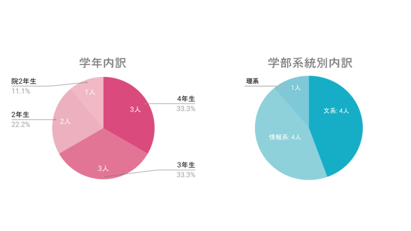2021年12月現在、インターン生は9名在籍しています。そのうち4年生と院2年生の合わせて4名が2022年3月に卒業します。学部系統は、現在は文系と情報系が多いですが、文系理系のみで半々だった時期や文系が多くを占めていた時期もあり、その時その時でまちまちです。