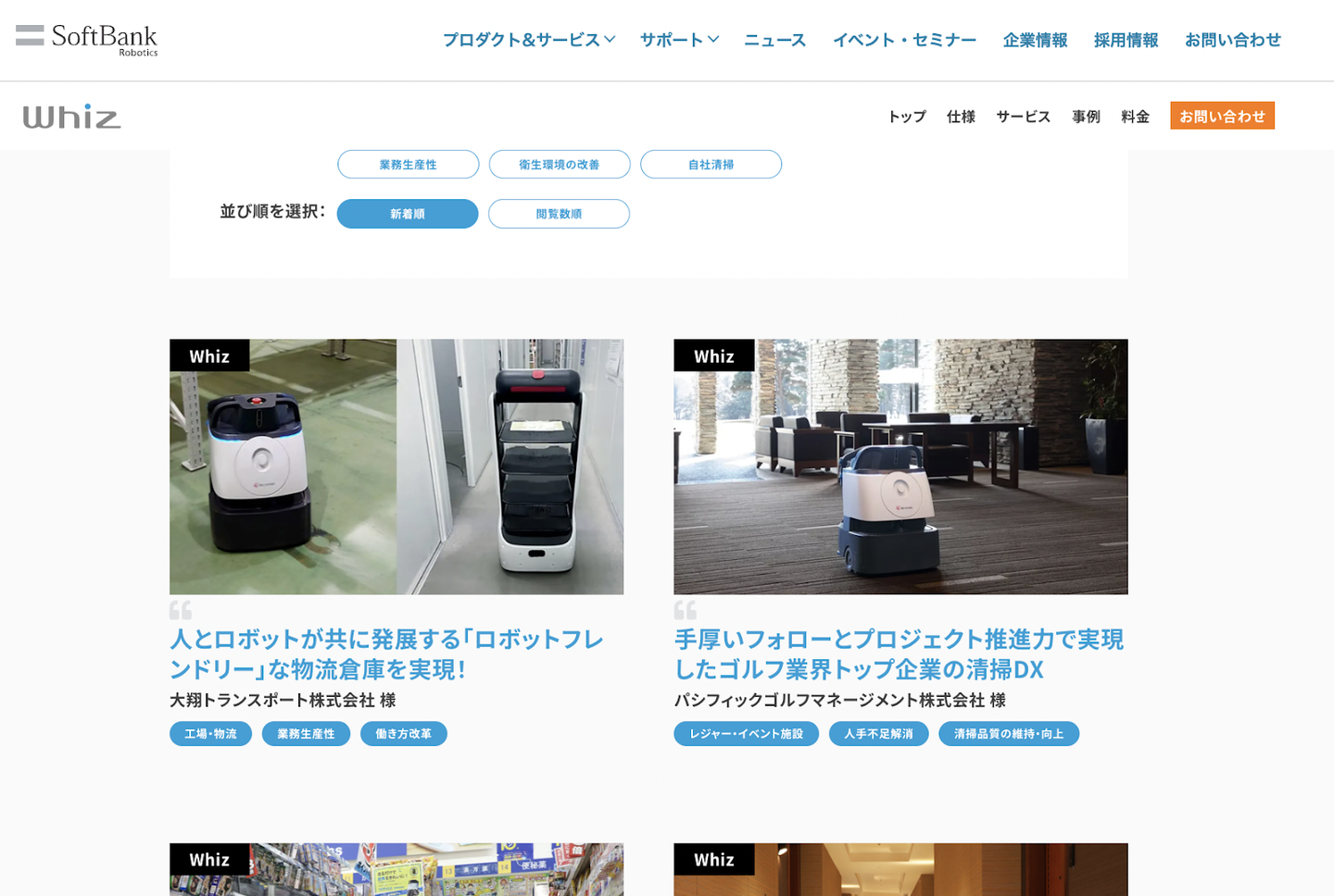 自社コーポレートサイトにて人型ロボットPepperや複数の配膳・運搬ロボットを紹介しているのですが、UI/UXの観点から既存のサイトデザインについての課題点をまとめ、それに対するデザインの考察や修正案を企画し最終的に本番環境への実装まで担当しました。また、新規ロボットのサイトデザインの提案を行う機会もありました。 - 画像素材や動画編集などのクリエイティブ対応