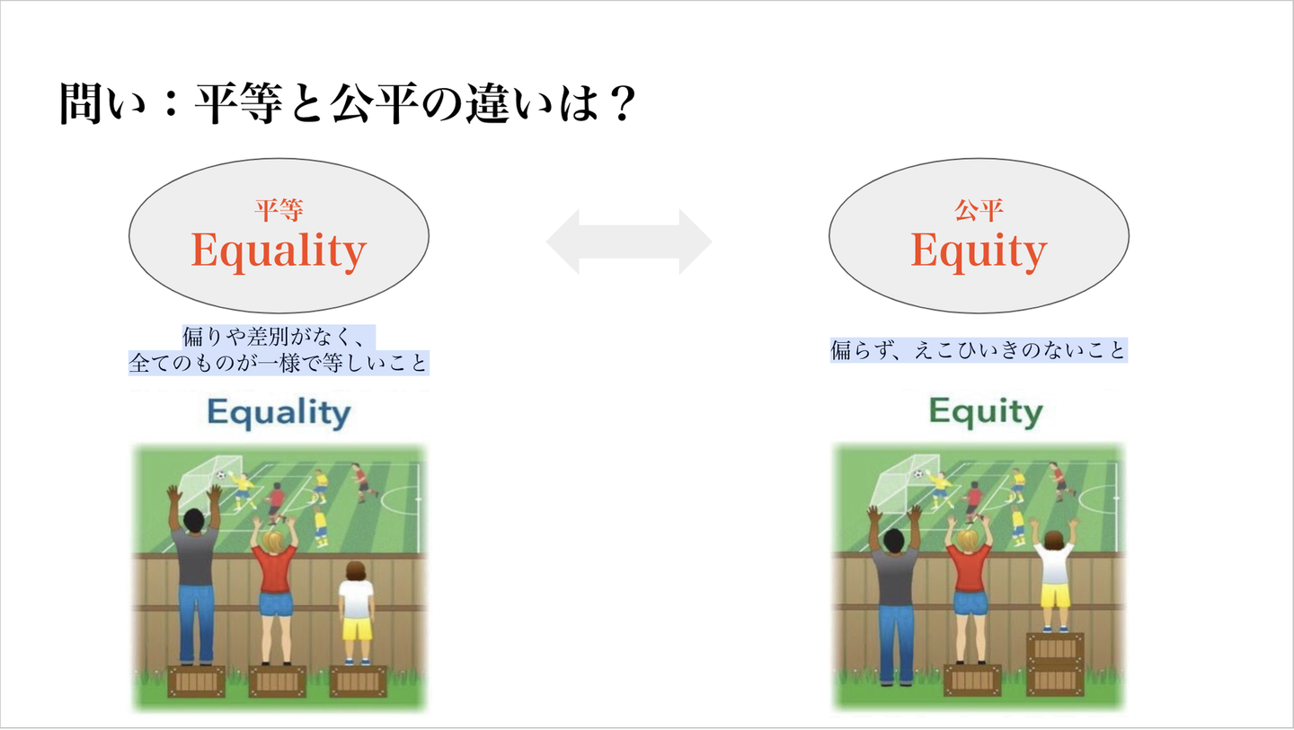これも難しい問いですね。「平等」「公平」と言った言葉は、その言葉単体で見ると誰しもが反論なく大切だと答えると思います。「多様な人を認めるためには、平等であるべきか? 公平であるべきか?」こう問うと皆さんの考え方にも、捉え方に差が出てくるのではないでしょうか?