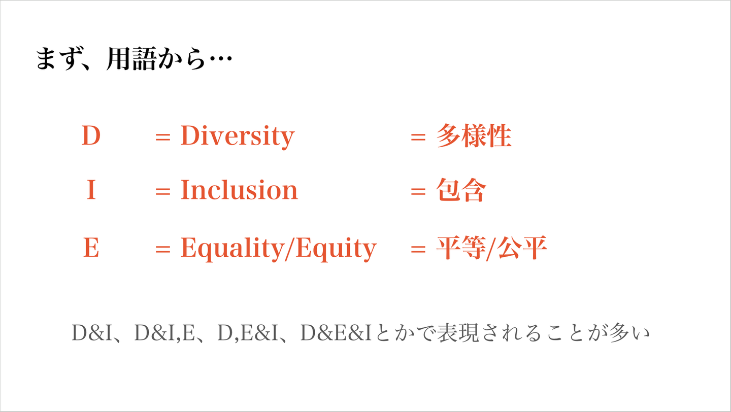 昨今世の中では、「D&I」「D&I,E」「D,E&I」「D&E&I」など様々に表現されることが増えてきたが、簡単に説明すると、以下の通りの略となる。