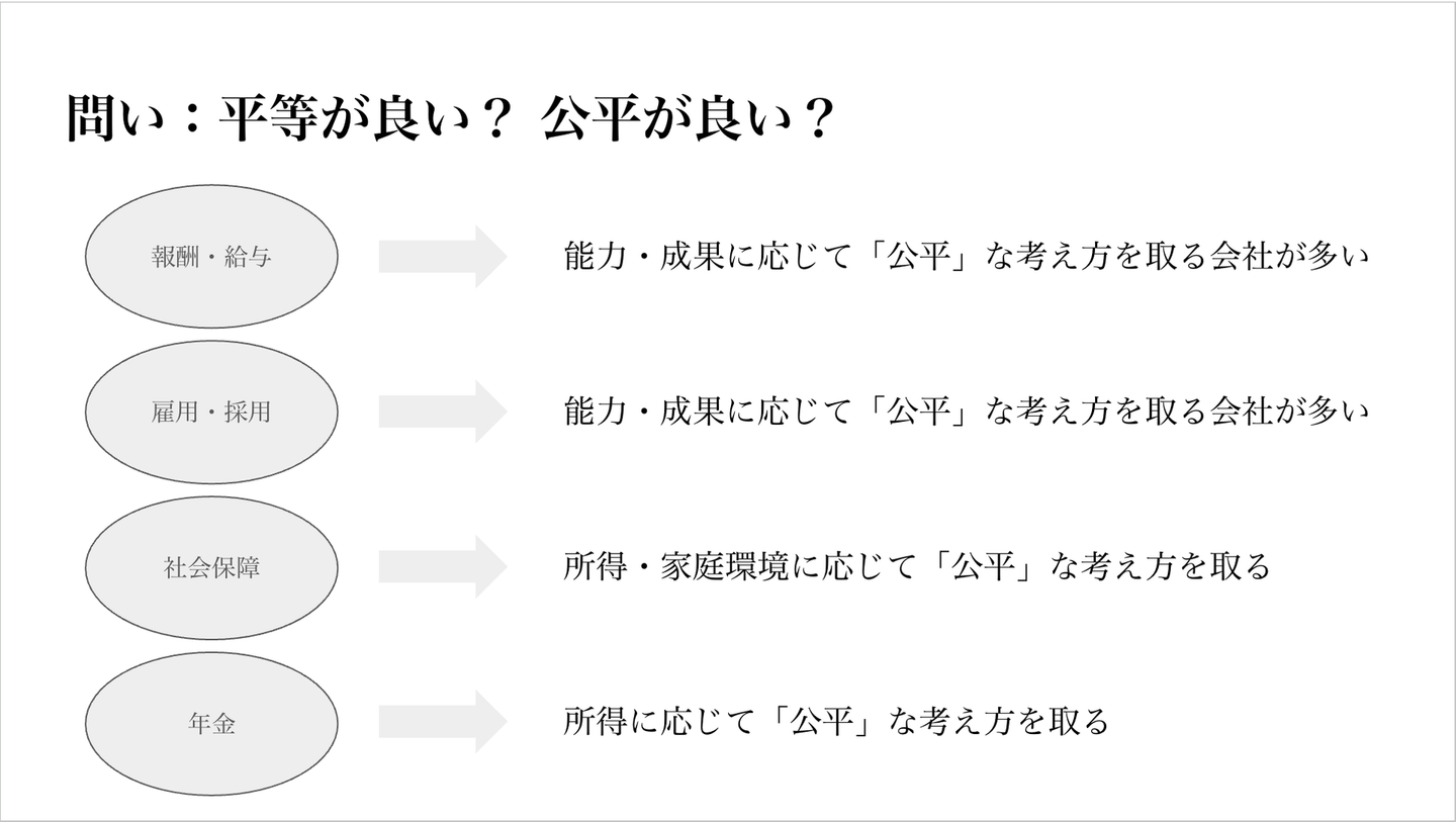 - 平等や公平は、その必要性や「何に対して」平等・公平なのかが重要。