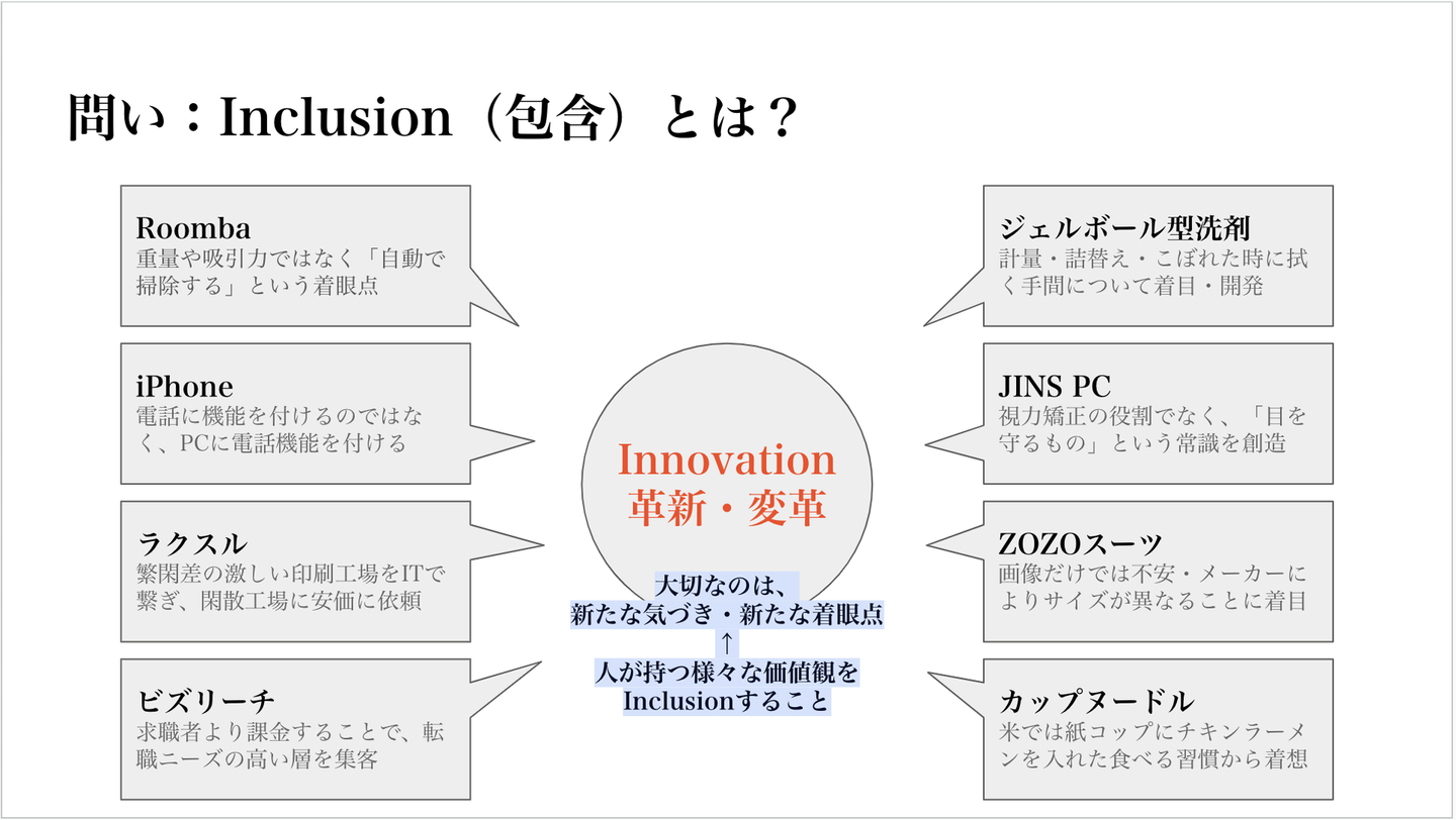 裏を返せば、Innovationで重要なのは、新たな視点・新たな気づき・新たな発想をいかに取り入れるかが大切で、その多くは新たな着眼点を交じり合わせる(包含・Inclusion)ことで生まれます。人はそれぞれユニークであり、その価値観・視点・強みは異なることを理解し、その多様性を交わらせることで新たな気づき・発見を得て、既成概念を脱する。こう捉えると、多様性の必要性や価値は格段に重要視されるでしょう。