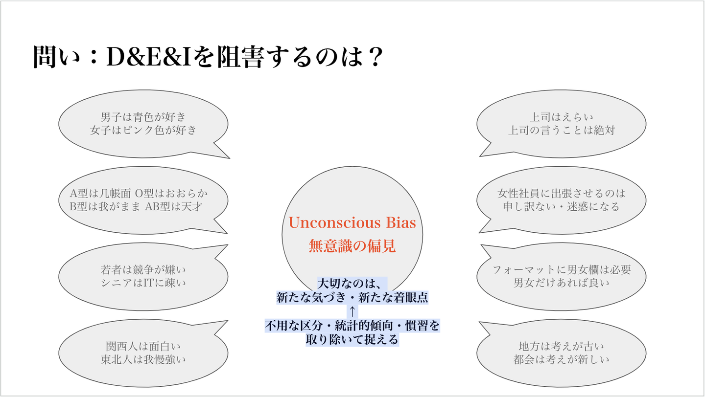 では、「ダイバーシティ」や「インクルージョン」を阻害するものは何でしょうか? 当然ですが、新たな気づき・新たな視点を阻害するのは、凝り固まった既成概念であり、無意識に生まれる偏見(Unconscious Bias)です。人は残念ながら、無意識の偏見を持ち得ています。それは、子どもの頃から家庭や学校などで自ずと植え付けられてしまいます。それは偏見を持つことで未来起こることを予測しやすくしている自己防衛本能と言っても良いかもしれません。が故に、無意識の偏見を完全に排除することは難しいかもしれませんが、時より立ち止まり、不用な区分や統計的傾向・慣習を取り除いて捉えることを意識し癖づけすることをオススメします。そうすることによって、皆さんは今まで以上に視座高く・視野広く、色んな可能性を排除せずに生きられるからです。なぜならば、未来は自身の経験則の延長にはなく、予測できないことも含めて変化し続けているからでもあります。