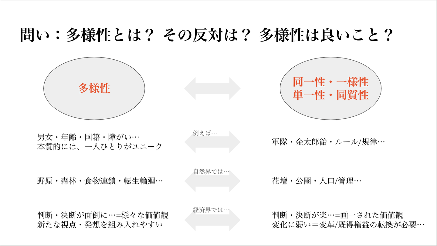 - 結果、多様性・同一性にも一長一短あり、同一視や区別するかを見極める必要がある。