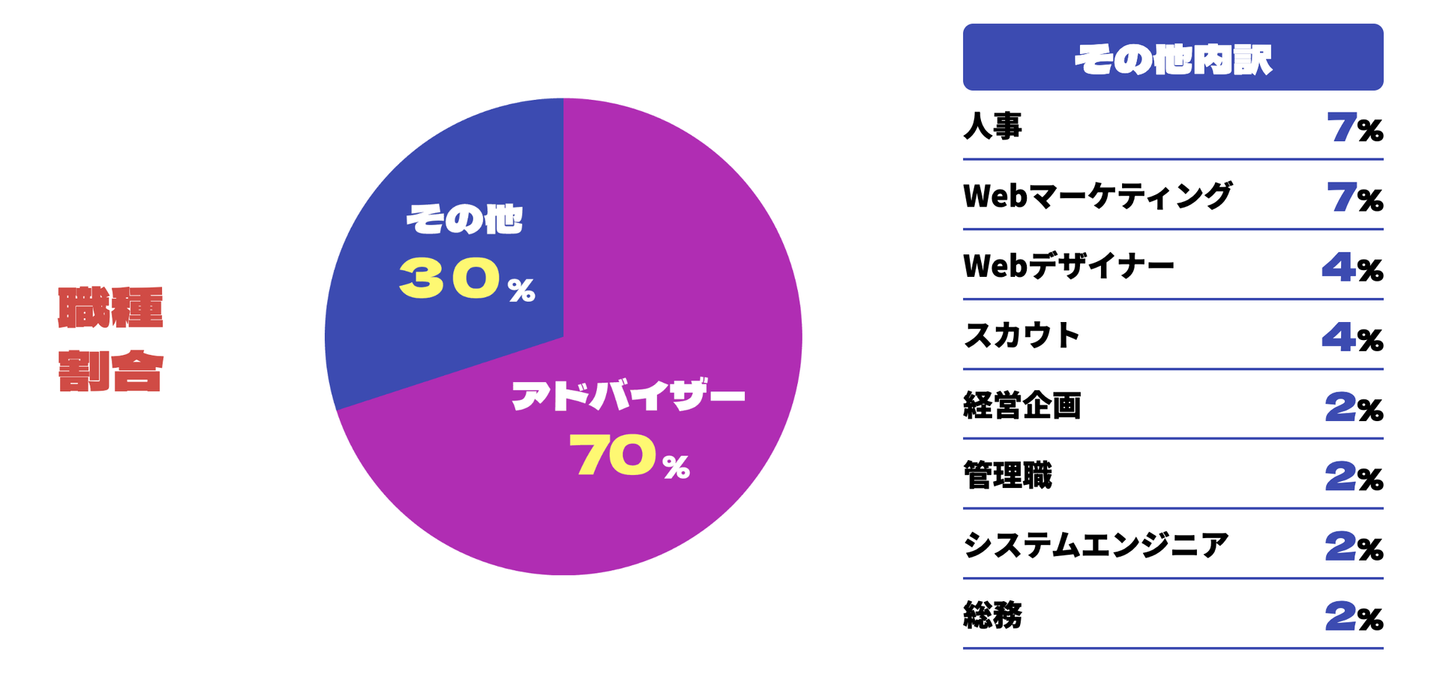 ご覧の通り、専門コンサルアドバイザーがソーラーパートナーズの70%を占めていますが、30%の職種で活躍している仲間たちは、それぞれの担当で日々業務に当たっています。この範囲の仕事は、新卒の皆さんが「専門コンサルタント」として経験とスキルを積んでいただいた後、本人の適性や希望によって担当する可能性がある職種となります。