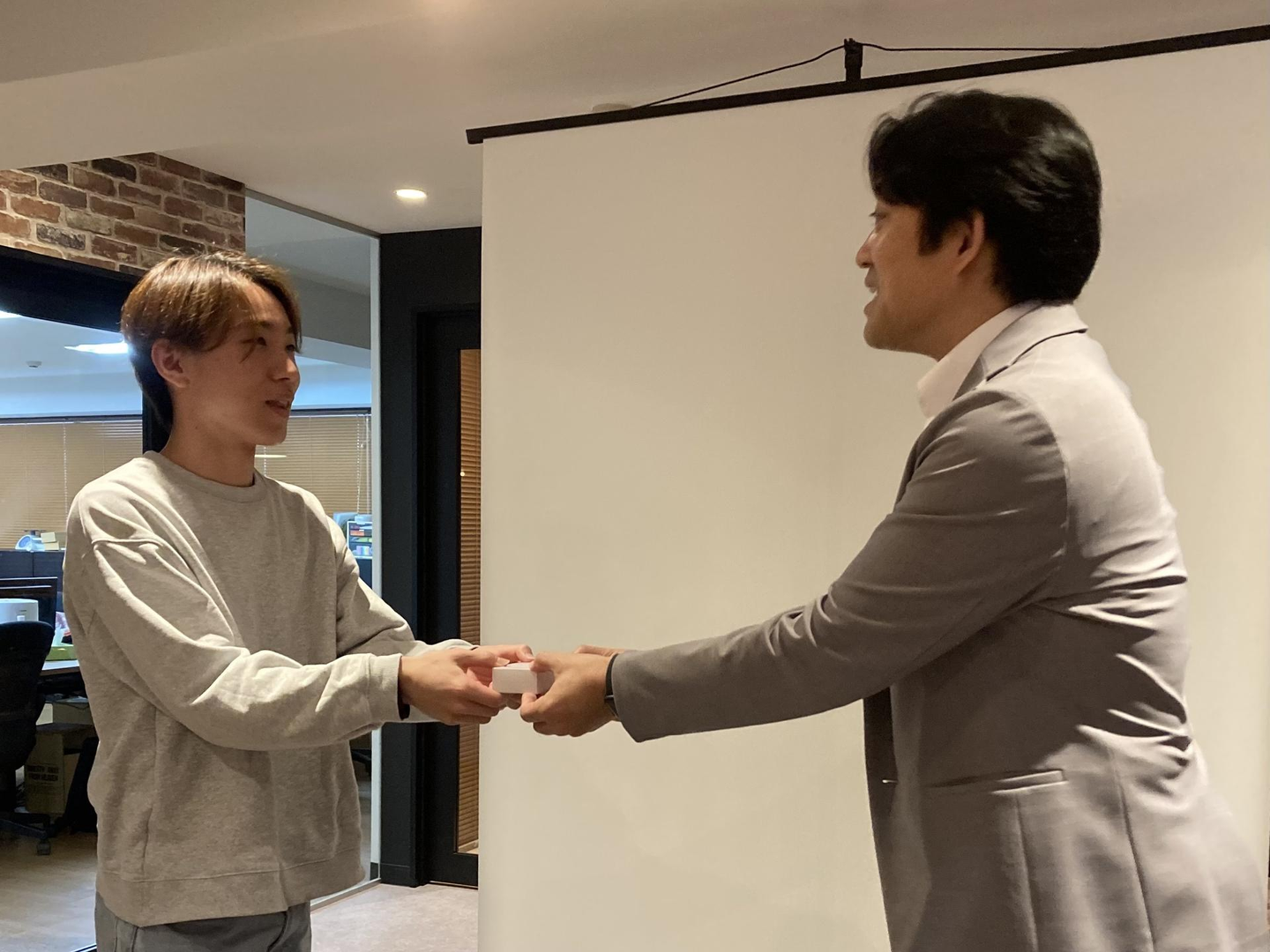 続いてソーラーパートナーズ社員の証でもある「名刺」を、一人一人に手渡します。生まれて初めてもらう名刺に、4人とも目をキラキラさせて受け取っている姿はとても印象的でした!研修が終わり正式な配属が決まったら新しい名刺に代わりますが、それまでは今回渡した名刺が仕事で使用する名刺です。併せてバーチャル社員食堂のカードも4人にお渡ししました。これは現社員も嬉しいし、新入社員の皆さんはもっと嬉しいと思います!