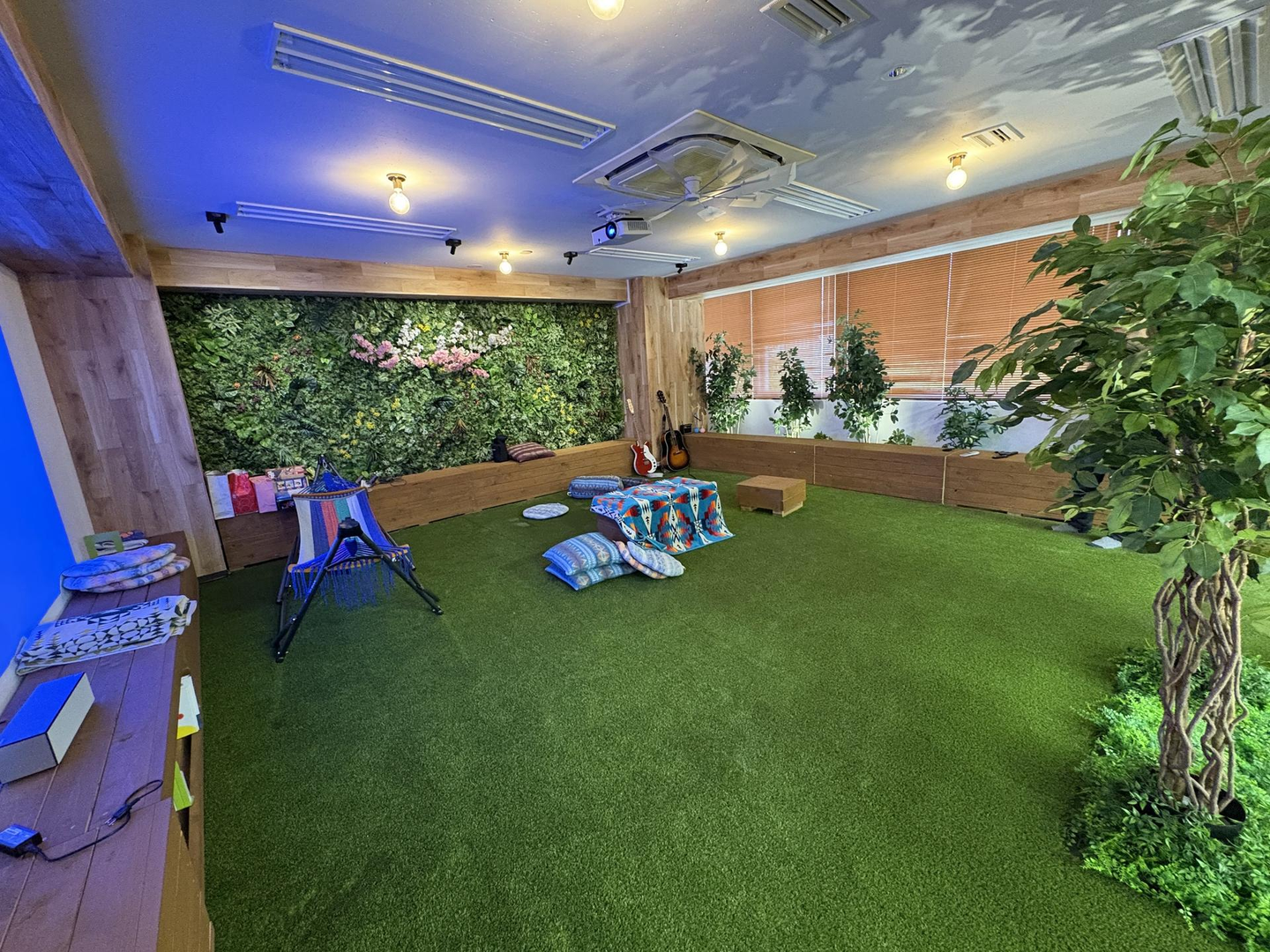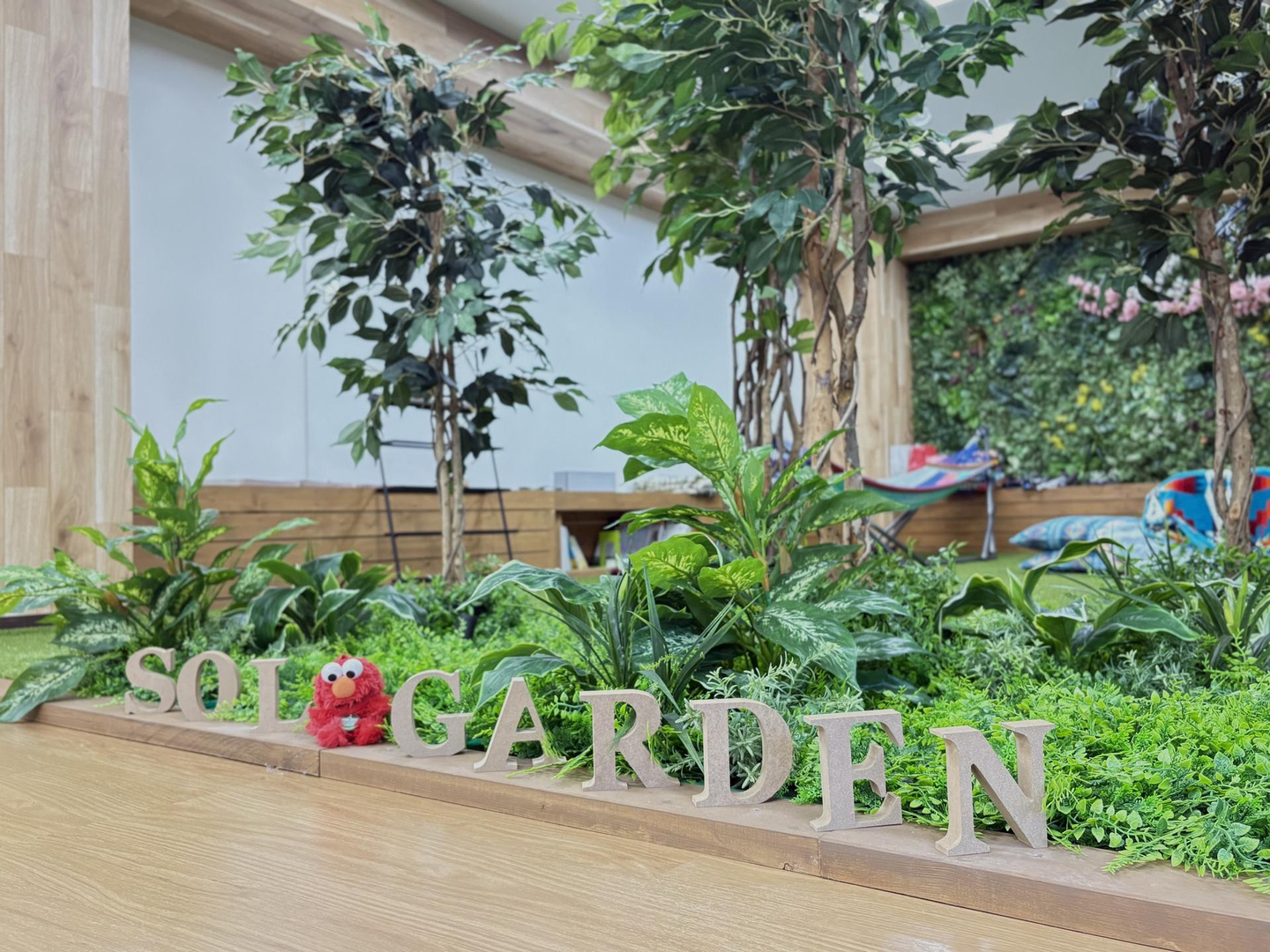 まずはSOL GARDENのご紹介。SOL GARDENは会社のオフィススペースの一角にある人工芝が敷いてあるガーデンスペースの事。かつては机が並んでいたスペースを、全社でテレワークに切り替わったことを機にオープンスペースへと変身させました。全体を緑が埋め尽くしていて癒される目に優しいスペースです。