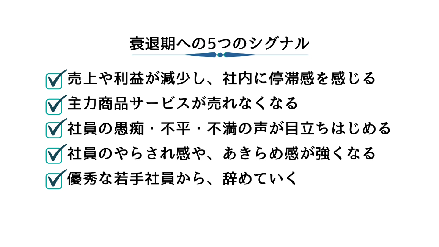 経営者であれば、自社が今どのタイミングにいるか。常に動向を理解し、把握したいところ。その基準として中小企業が成熟期から衰退期へ向かうシグナルは、次のようなことがあります。