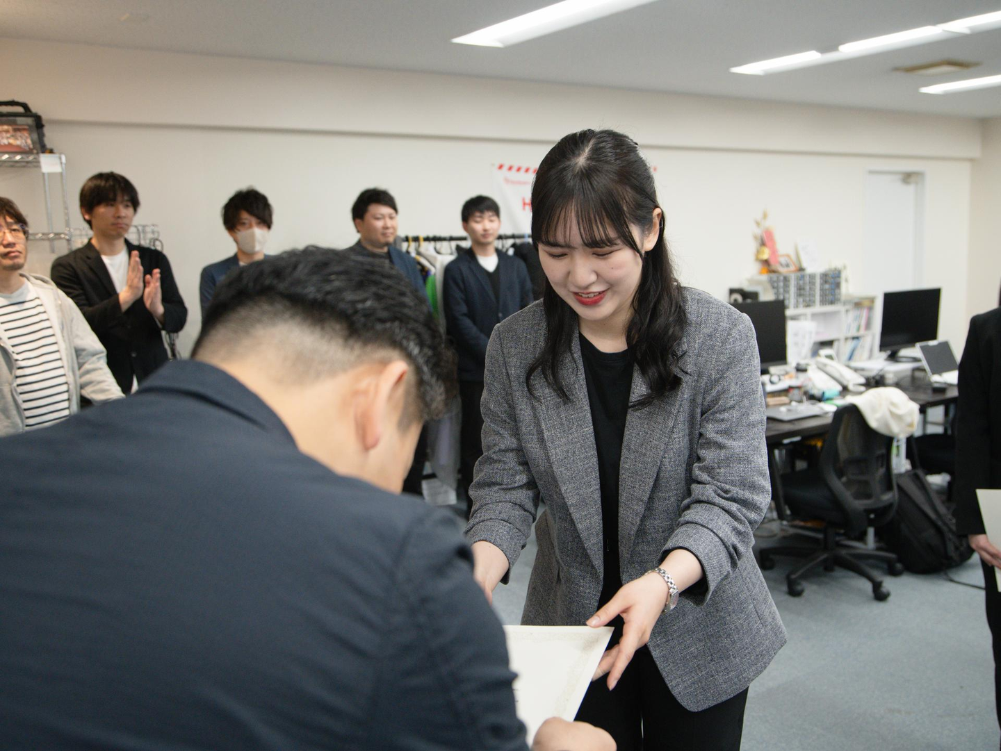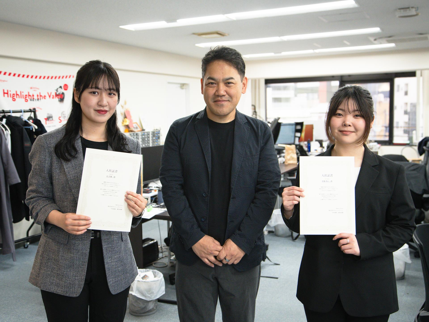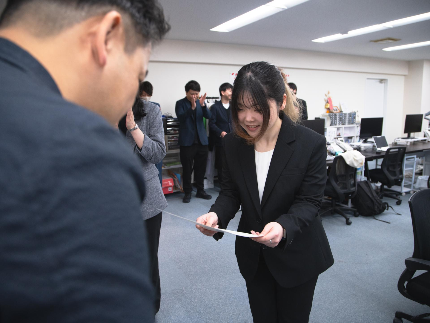 大阪オフィスでは、社長から新卒のお2人へ入社証書が授与され、