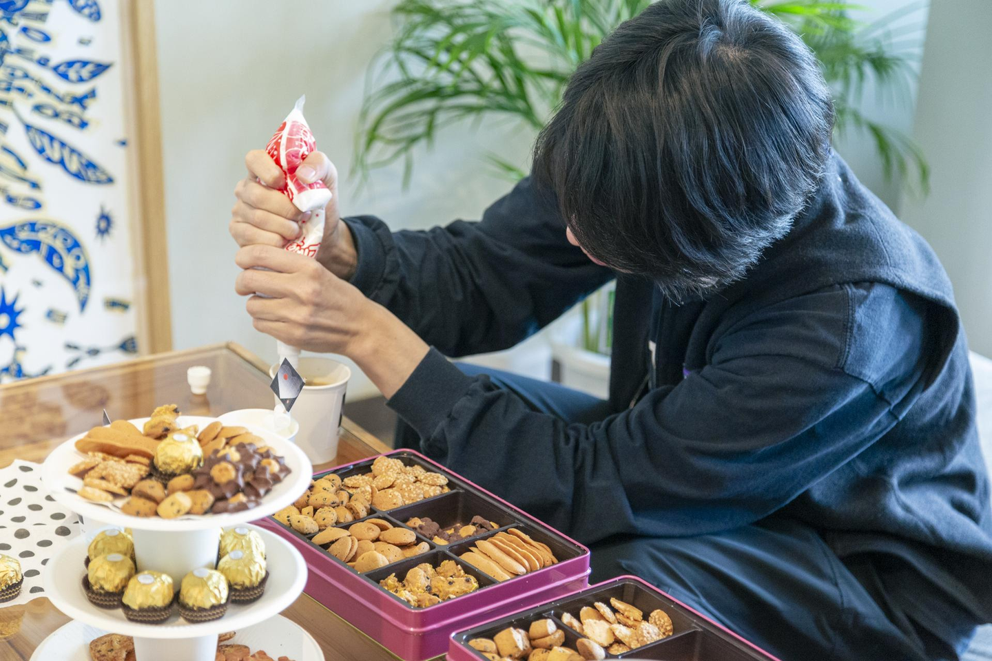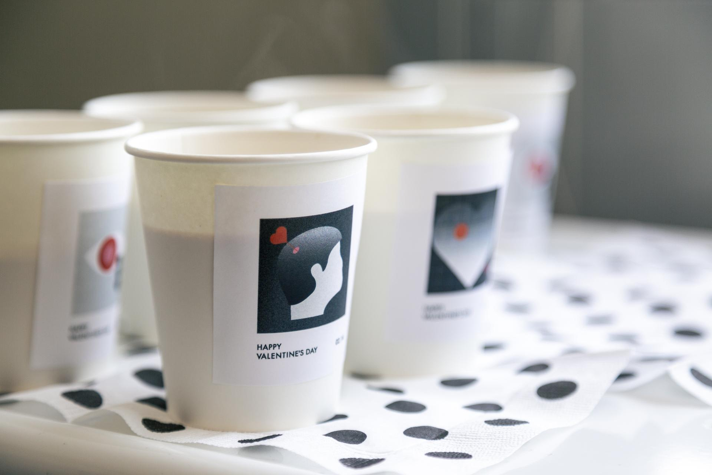 デザイナーのイラストをカップやフードピックに施し、洗練されたモノトーンのテーブルコーディネートに。 新しいオフィスで和気あいあいと楽しみました。