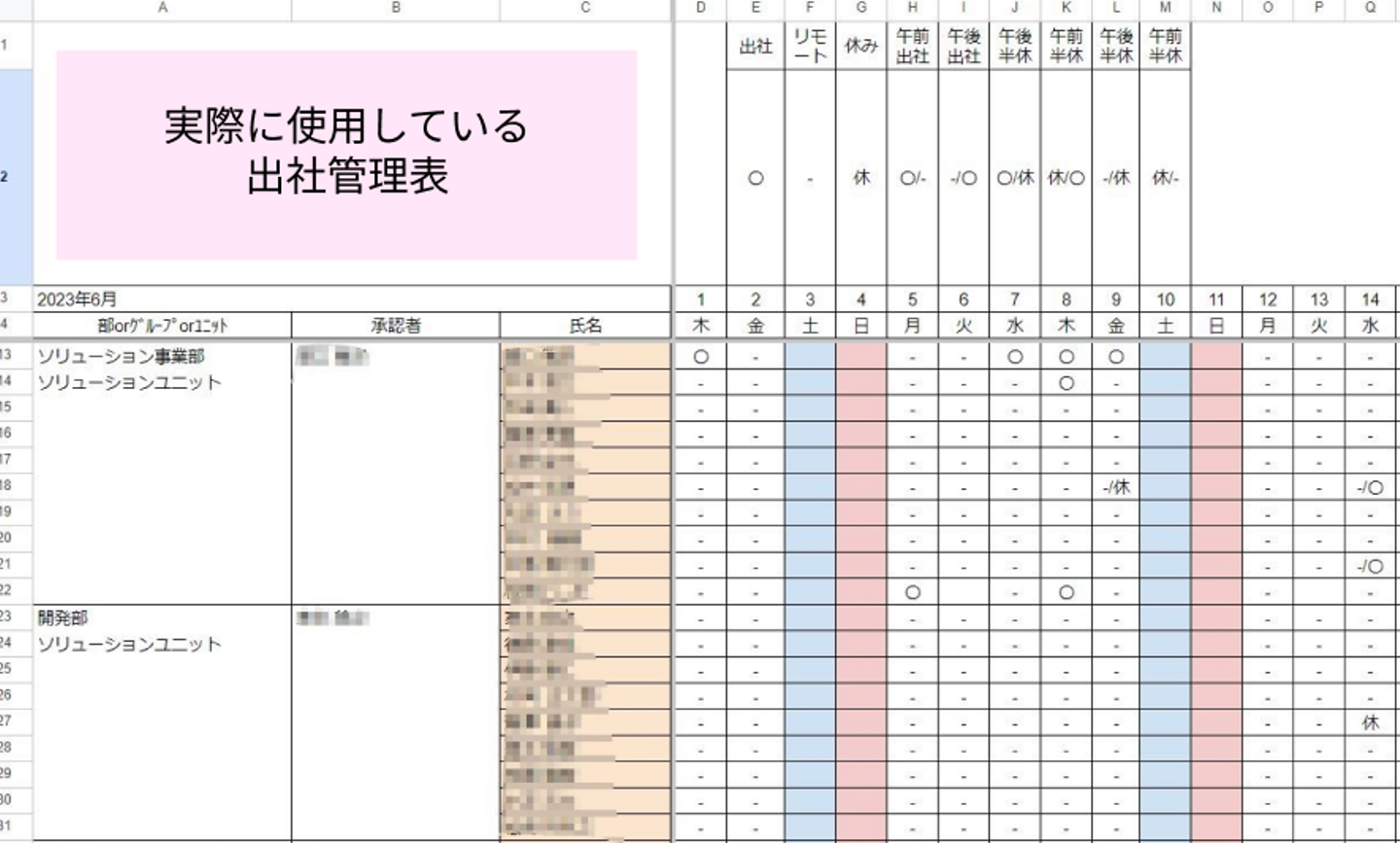 出社するか否かについては、スプレッドシートにて出社管理をしています。「〇」が出社、「-」がリモートでの対応になるのですが、リモートで対応している社員が多いです。