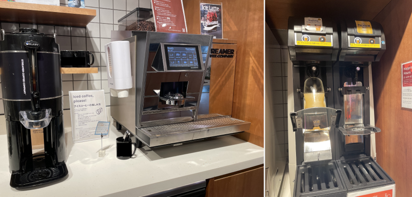 コーヒーやお茶、水 等フリードリンクで、17:00~19:00の間でビールサーバーも解放されます(出社する人は少し早めに上がってビールを飲んでます!)。