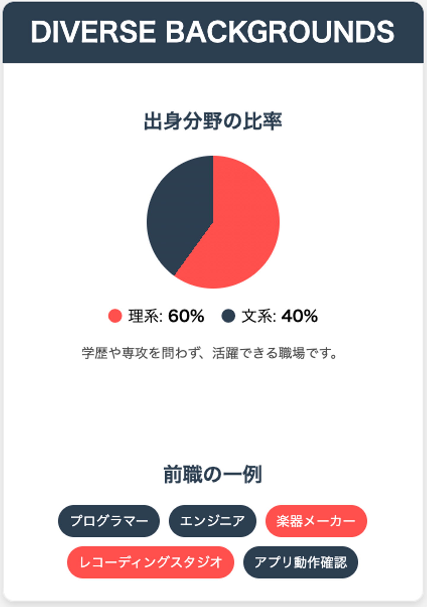 社内の学歴を分野別でみると理系出身者、文系出身者が6:4と想像していたよりも理系への偏りがありませんでした。