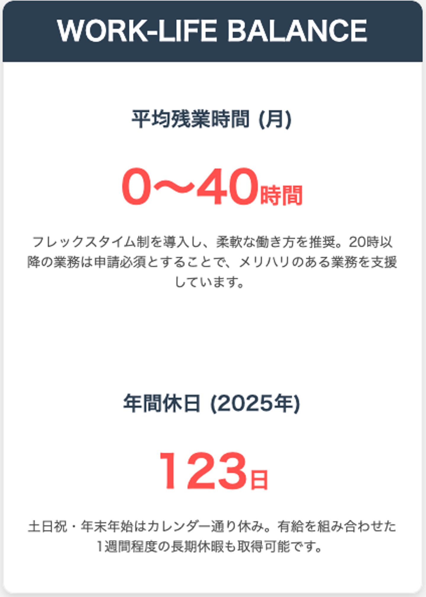 20時以降の業務については残業申請を必須にしているため、20時までに業務を終えられるように考えるきっかけにしていただいています。