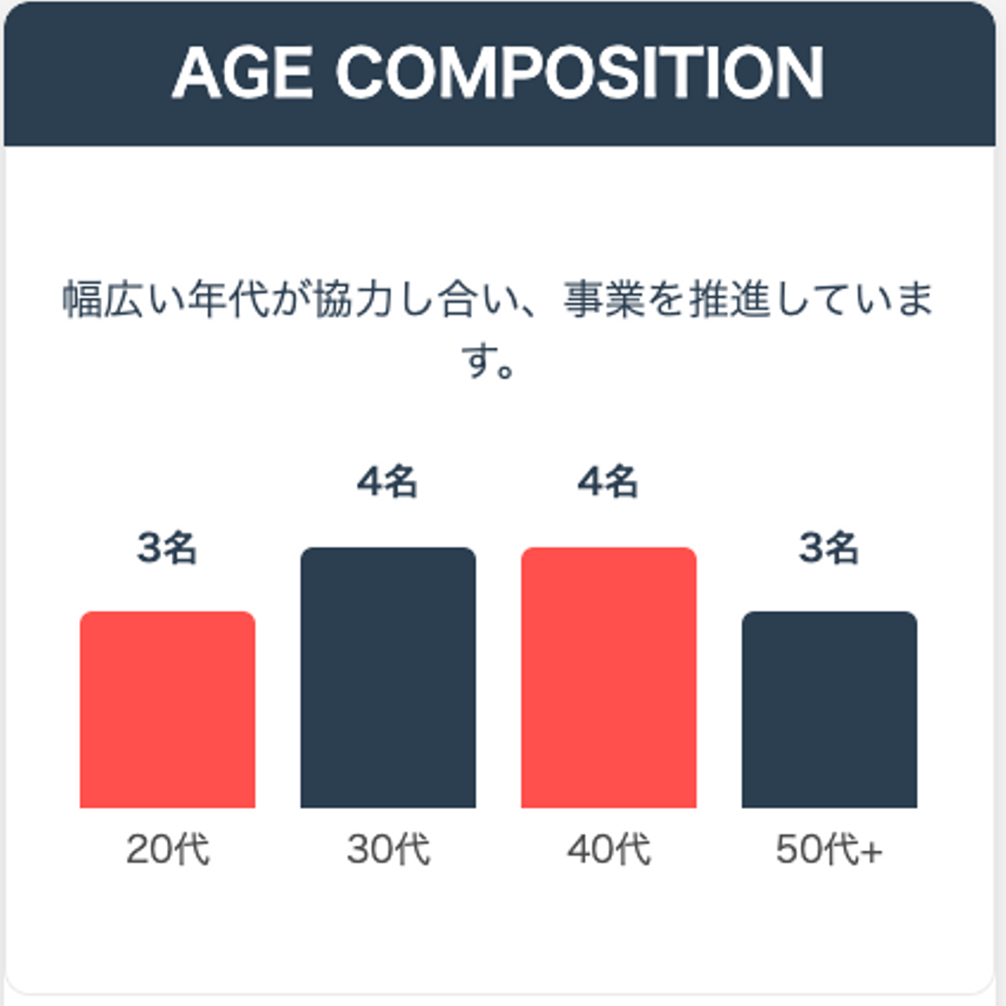 会社を支える40代・50代のメンバーが確かな経験と洞察をもとにチームを導く一方で、20代・30代の若手社員は柔軟な発想と前向きな姿勢で新たな挑戦に取り組んでいます。世代を問わず、日々の業務の中で意見が飛び交い、互いに刺激を受けながら学び合う環境がチームとしての力を最大化し、会社としての前進につなげています。