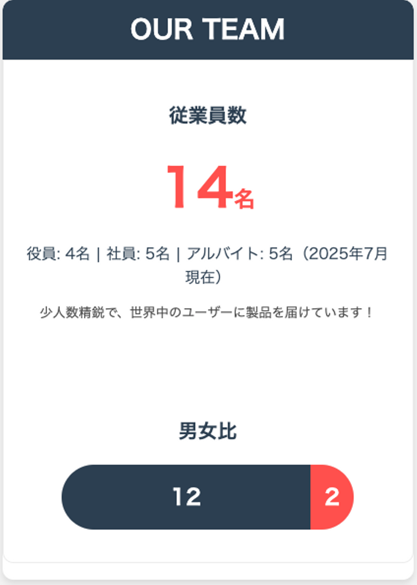 また、従業員14名のうち男性が約85%を占めていますが、性別に関わらず誰もが意見を言いやすく、挑戦できるカルチャーを育んでいます。今後も多様な視点を取り入れるべく、さまざまな人材を積極的に採用していきます。