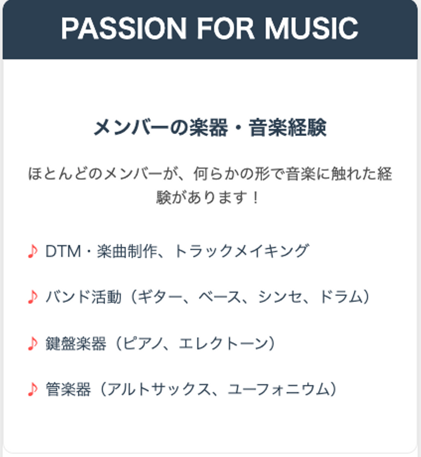 社内アンケートを通じて、各メンバーの楽器経験や音楽活動について尋ねたところ、1年未満から10年以上にわたる経験を持つ方まで、非常に幅広い層がいることがわかりました。