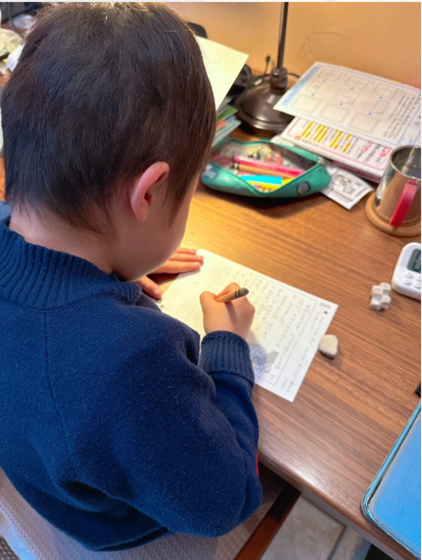 毎朝、仕事の前に1時間〜1時間半、息子と並んで算数、国語、英語をこなします。 横で見てないとすぐにサボります。