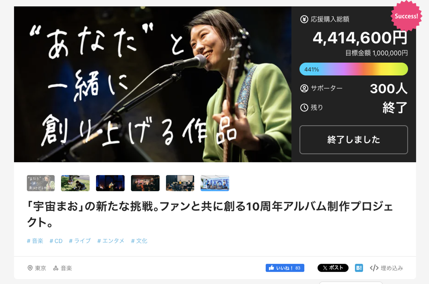 たくさんの支援・サポートをいただき、目標金額の441%達成でクラファンのプロジェクトが終了し、最終的に制作予算として441万円が集まりました。