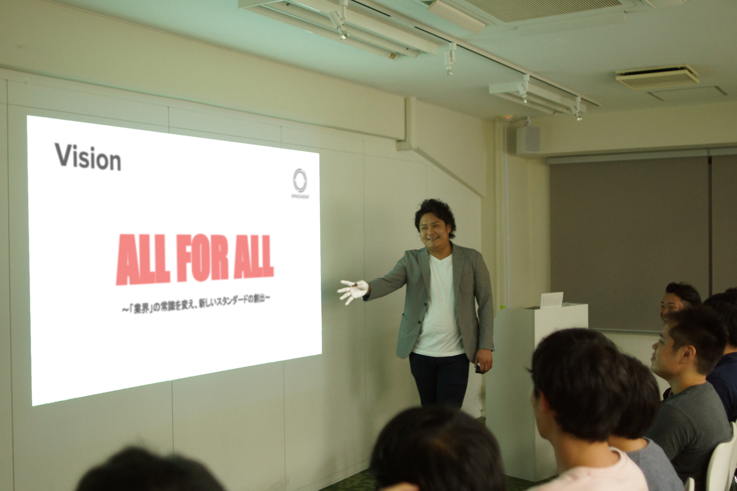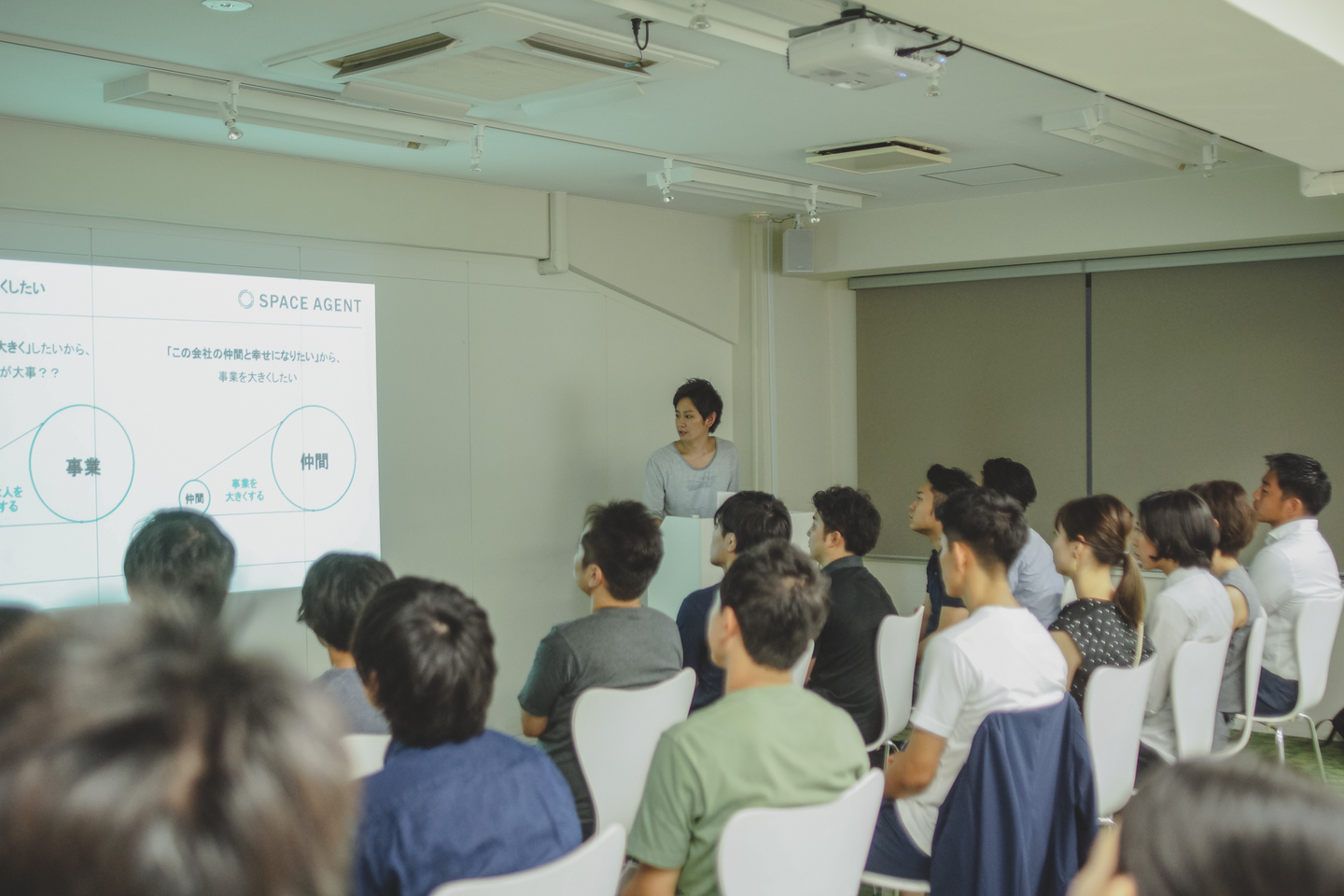 みんなには理念である「 利他主義 」を大切にしてほしい。 (紙中)人生って色々なことがありますよね。僕は、ずっと頑張っていたことが終わって一種のバーンアウト現象でやる気をなくしていた時期があったのですが、そのときにある起業家の先輩が何も言わずにボンッと現金で資金を提供してくださったんです。 その時に、僕のような人間を信じてくださる方の為に一生懸命頑張ろうと想いスペースエージェントの立ち上げを行い、且つ自分も同じような事ができるように「利他主義」という言葉を理念としました。 起業当時はがむしゃらに働いてても何かが物足りず満たされなかったんです。それはたったひとりで頑張り続けるのがしんどかったから。でも、数人が参画してくれたところから、徐々に人数が増えていく中で、みんなの成長を見れるのが凄く嬉しいことだと気づきました。 みんなには理念である「 利他主義 」を大切にしてほしい。“みんな”で会社をつくって行きましょう。 これまできちんと聞いたことのなかった創業時の想いなどを、創業者の口から直接語って頂きました。 メンバーみんなにとっても、改めてじっくりと考えさせられる時間だったのではないでしょうか。
