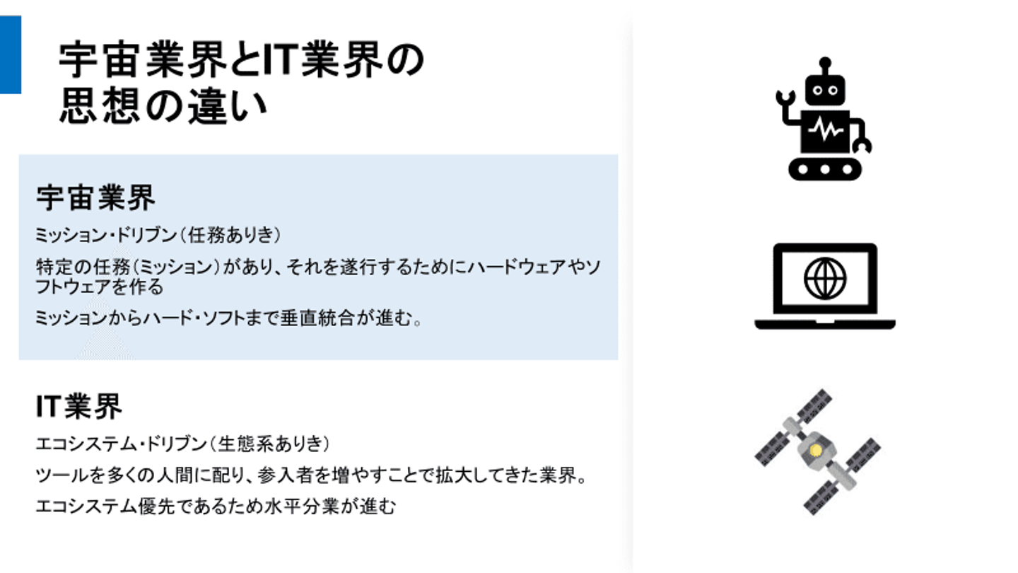 宇宙業界とIT業界は正反対の思想を持っています。