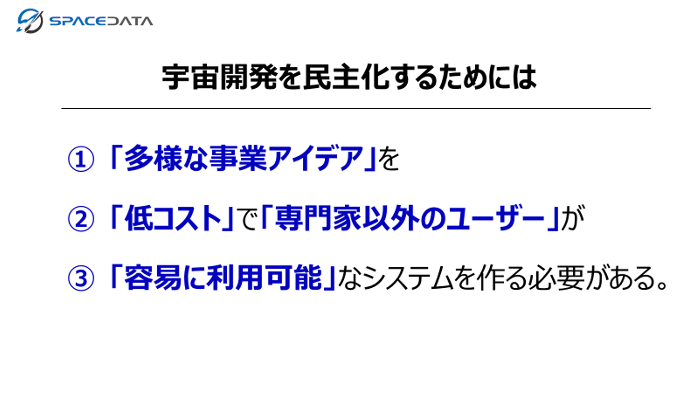 業界に閉じた知を開放することで、宇宙産業もIT的な進化を遂げる事ができるのではないかという仮説を持っています。