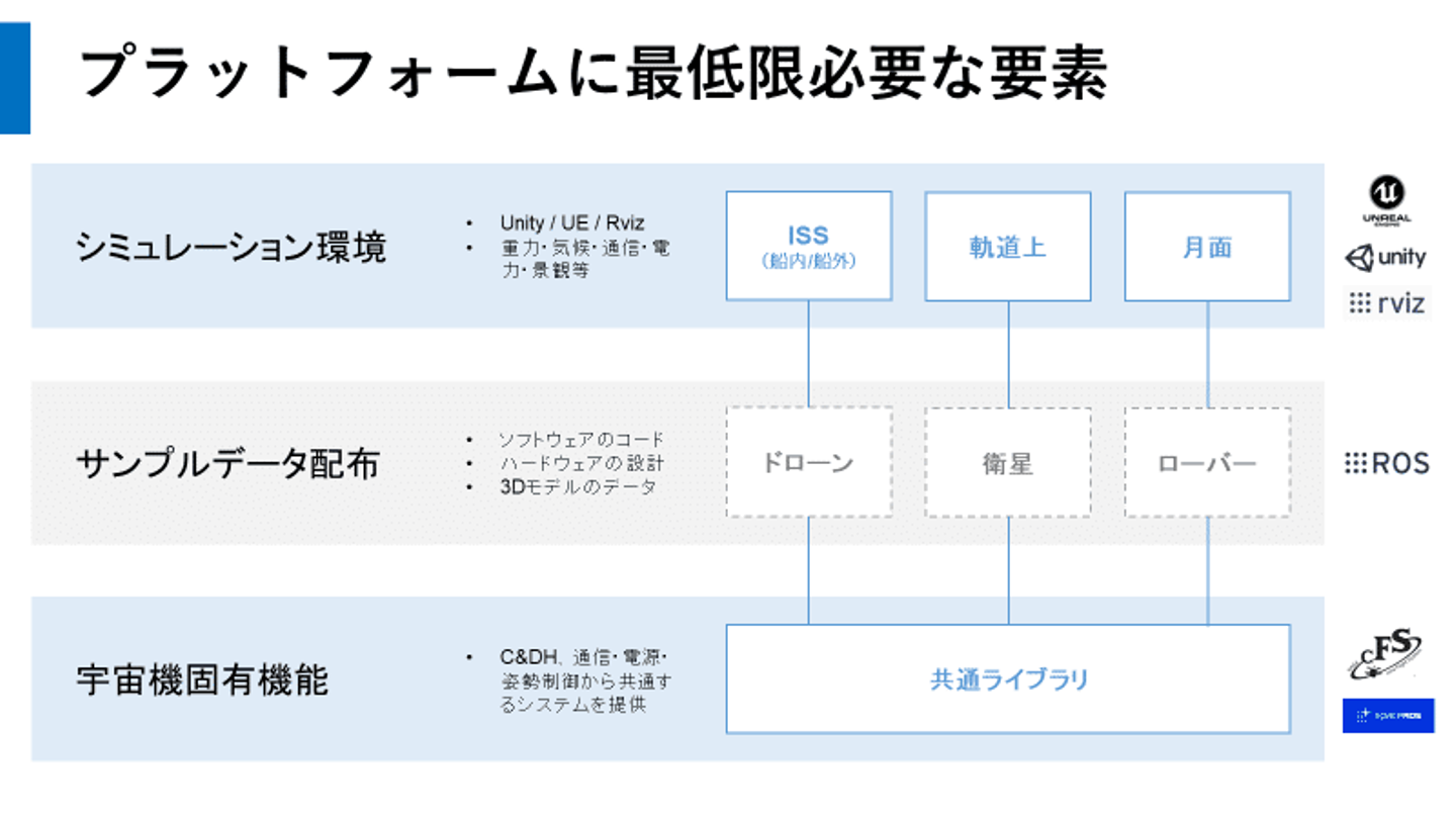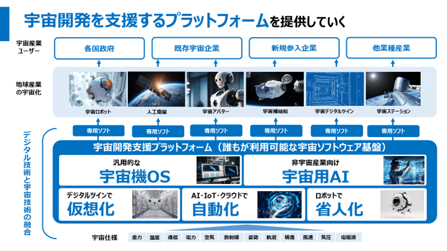 概念的な絵になりますが、宇宙固有の環境条件や利用制約等の知見が無いユーザーでも、私たちのプラットフォーム上で直ぐに宇宙開発に参入可能なプラットフォームを開発しています。
