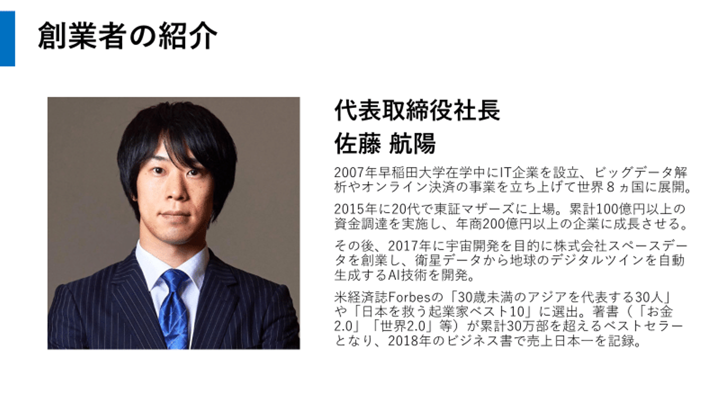 代表の佐藤は、20代で東証マザーズへの上場を果たすなど、IT業界で顕著な成果を上げてきた企業家です。