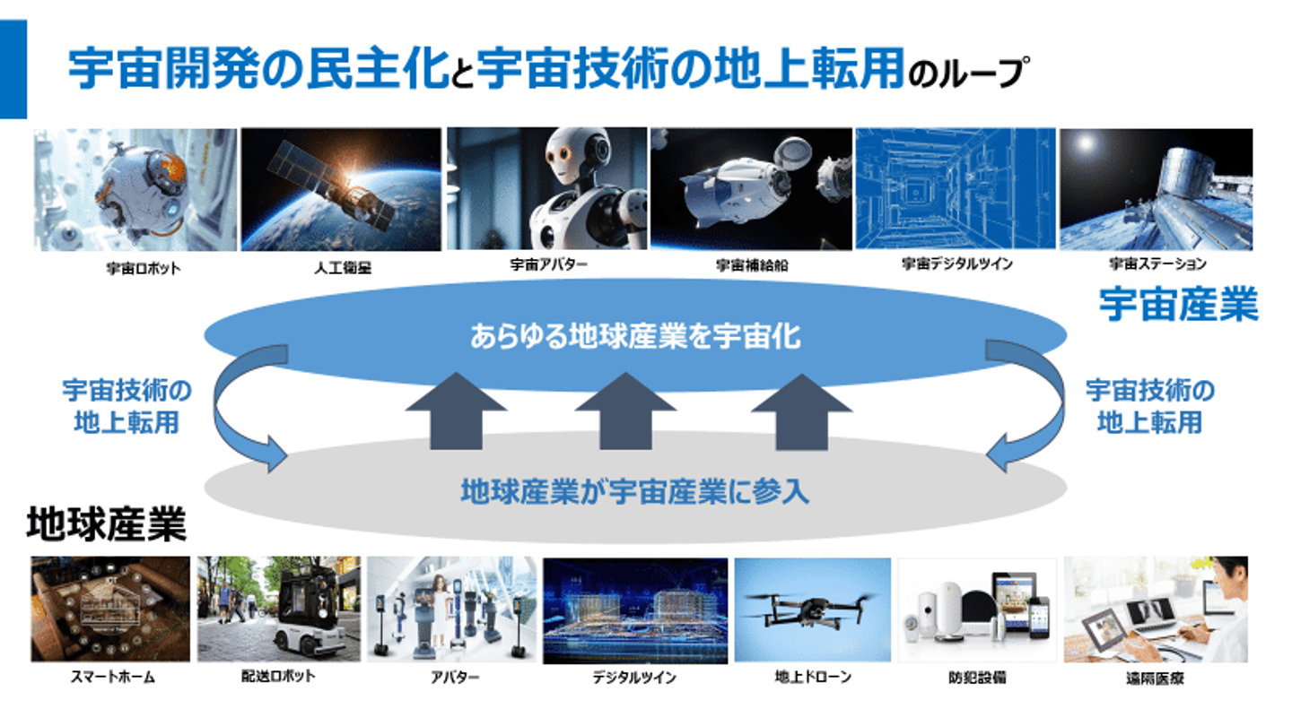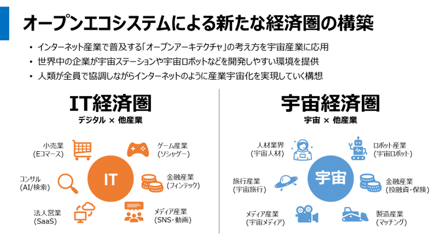 あらゆる産業が「IT化」し、インターネットを軸に1つのエコシステム・経済圏が形成されたモデルを宇宙産業にも応用していく考えです。