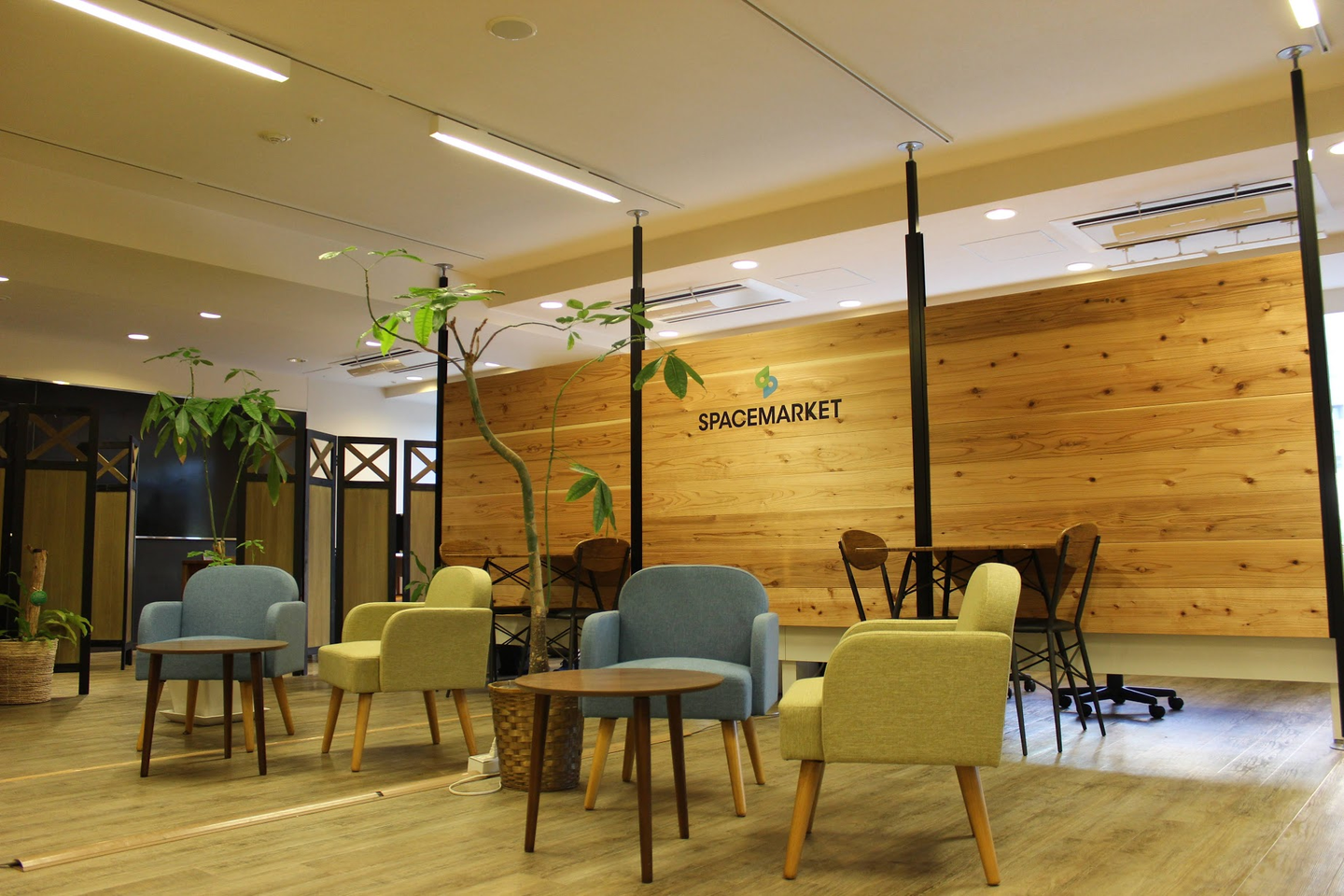 カフェ風の落ち着いた空間の中に、スペースマーケットのコーポレートカラーである青と緑のソファがいいアクセントになっています!