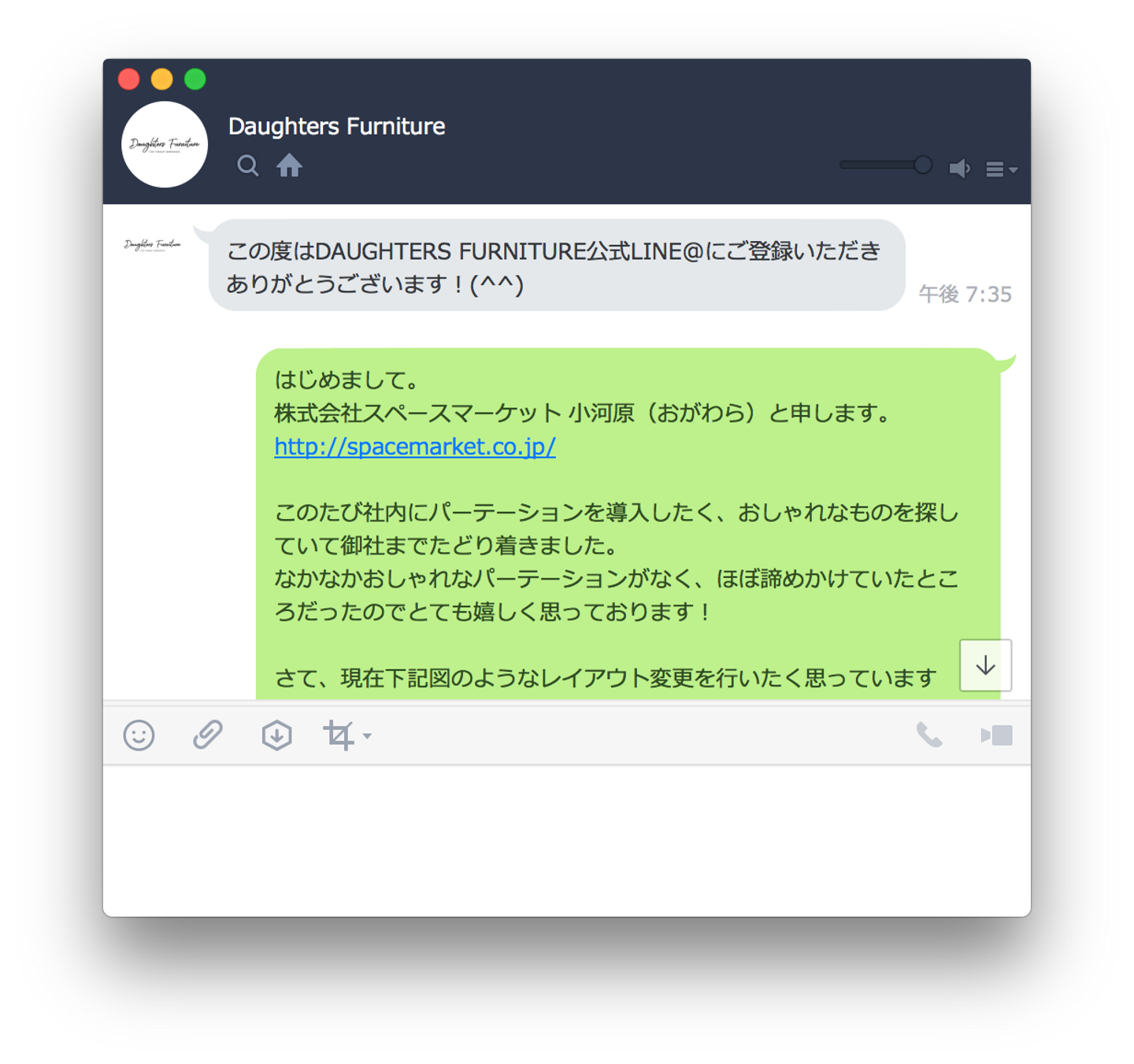DAUGHTERS FURNITUREさんはメールだけでなくLINE@でのお問い合わせ・注文も受け付けており、サクサクと相談に乗ってもらえたのもとても良かったです。